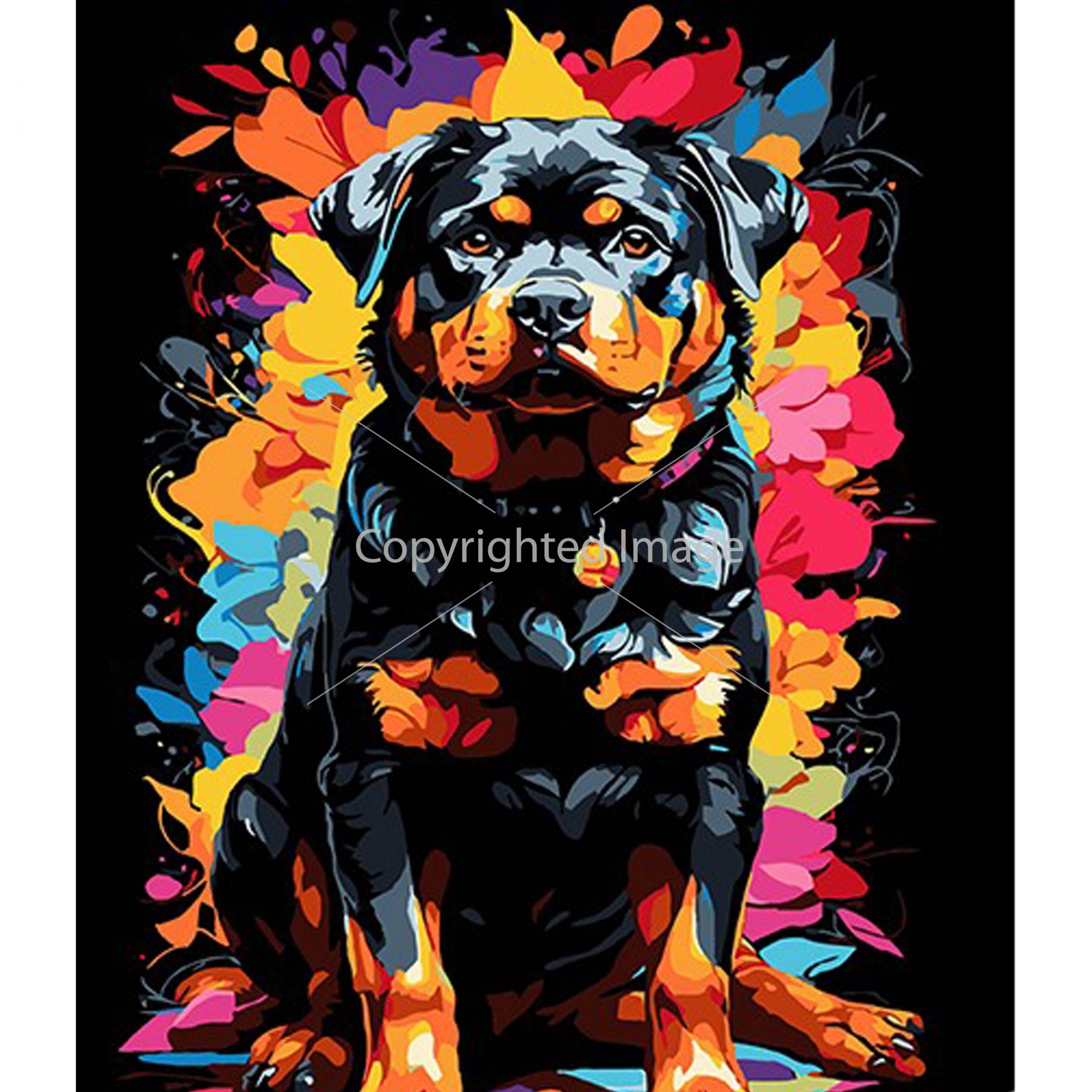 Картина за номерами Strateg ПРЕМІУМ Ротвейлер на фоні кольорових квітів на чорному фоні розміром 30х40 см (FH-10)