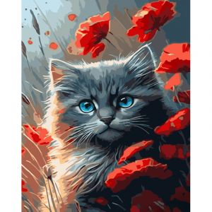 Картина за номерами Strateg ПРЕМІУМ Сірий котик у маках з лаком та з рівнем розміром 40х50 см (GS1485)
