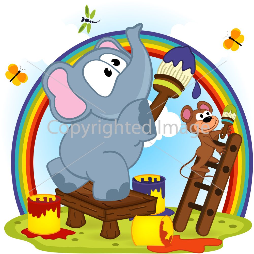 Картина за номерами Strateg ПРЕМІУМ Слон та мавпа малюють веселку з лаком та з рівнем розміром 30х30 см (ES178)