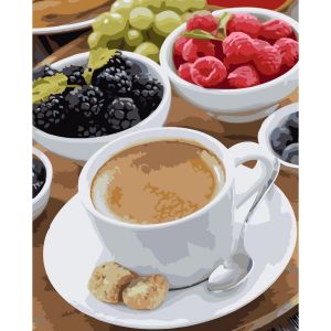Картина за номерами Strateg ПРЕМІУМ Сніданок з кавою та фруктами з лаком розміром 40х50 см VA-3741