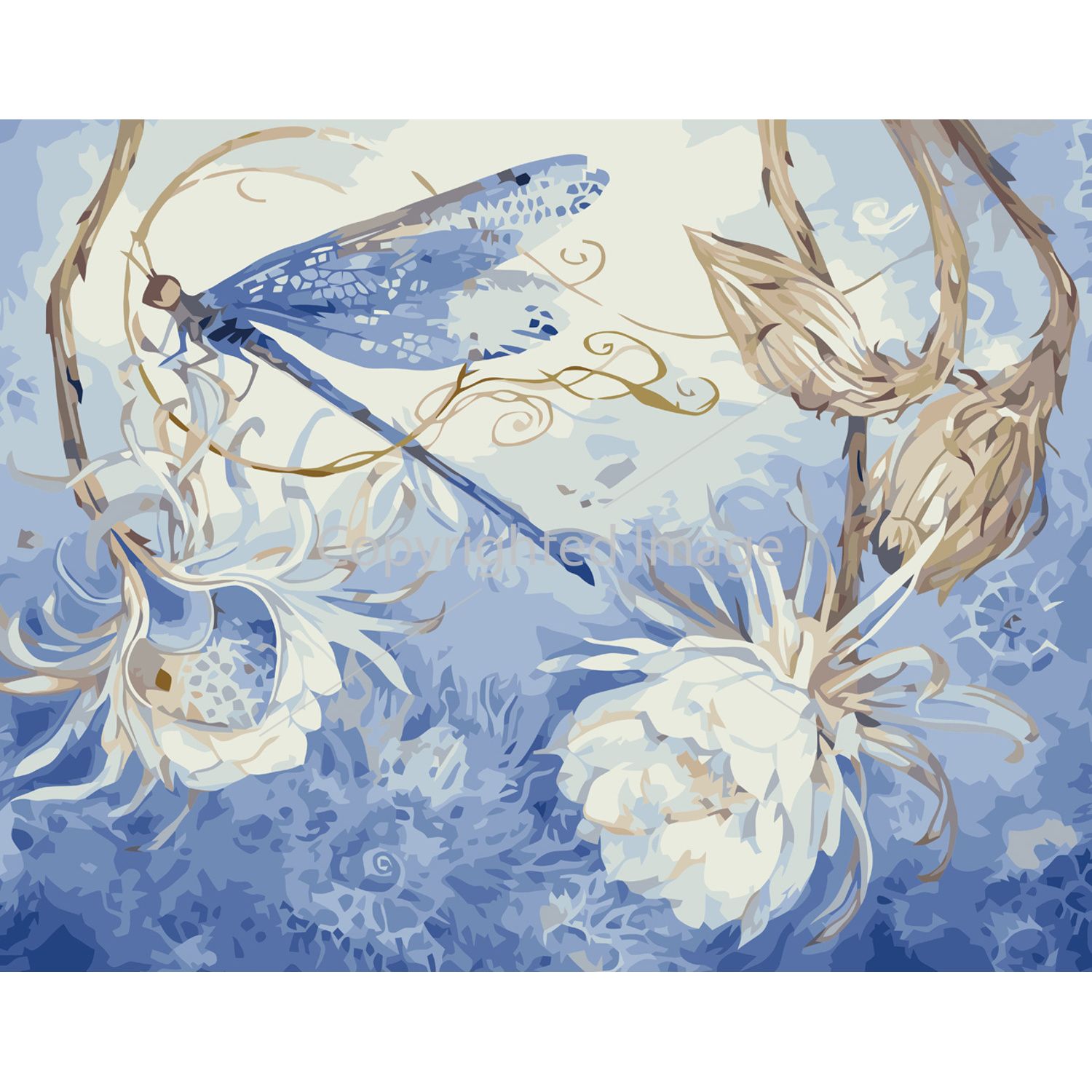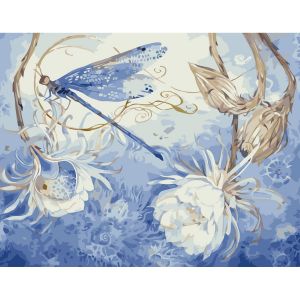 Картина за номерами Strateg ПРЕМІУМ Стрикоза на квітах з лаком розміром 40х50 см VA-3620
