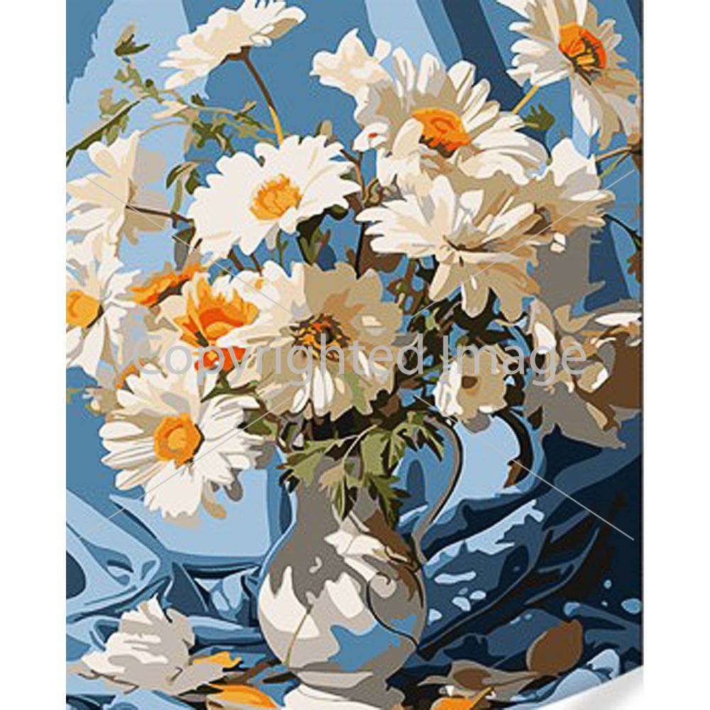 Картина за номерами Strateg ПРЕМІУМ Ваза з білосніжними ромашками з лаком та з рівнем розміром 30х40 см (SS1066)