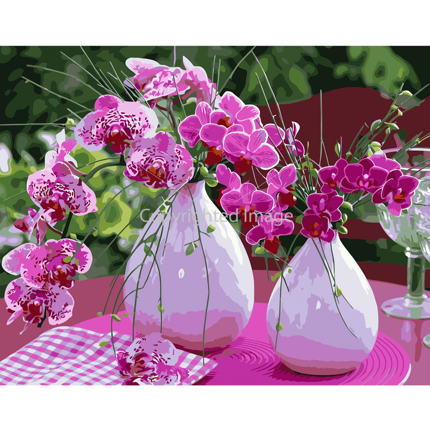 Картина за номерами Strateg ПРЕМІУМ Яскраві орхідеї на столі з лаком розміром 40х50 см VA-2501