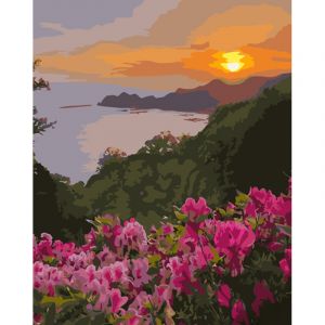 Картина за номерами Strateg ПРЕМІУМ Захід сонця та квіти з лаком розміром 40х50 см (GS1274)