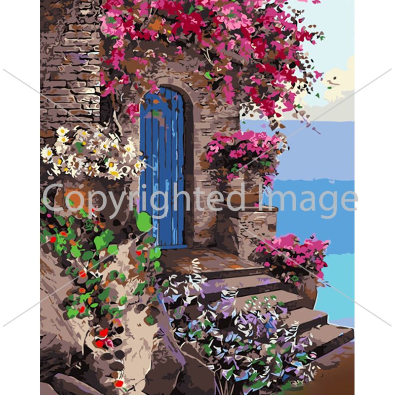 Картина за номерами Strateg ПРЕМІУМ Заквітчений ґанок з лаком та з рівнем розміром 40х50 см (GS1462)