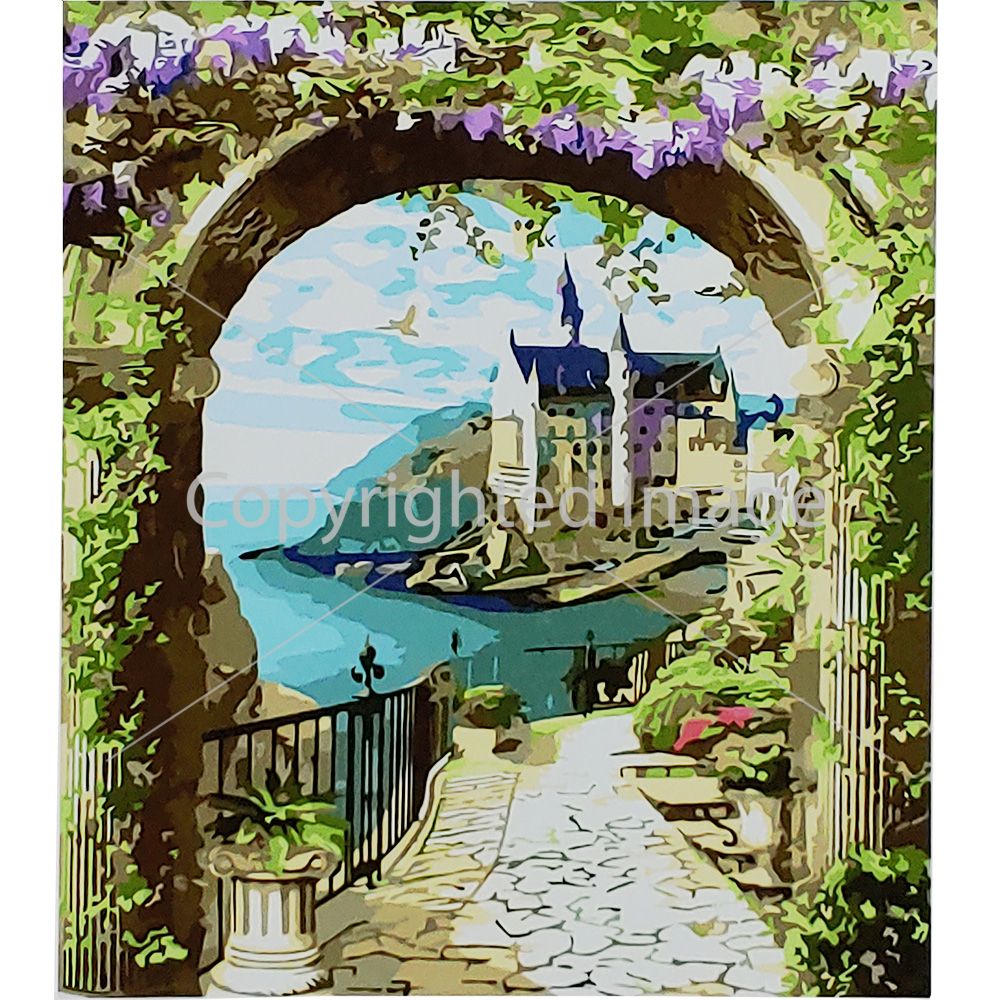 Картина за номерами Strateg ПРЕМІУМ Замок через арку з лаком розміром 30х40 см (SS-6548)