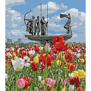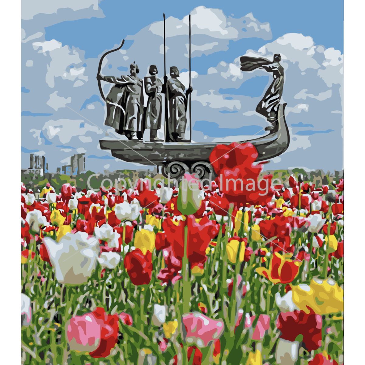 Картина за номерами Strateg ПРЕМІУМ Засновники серед тюльпанів з лаком розміром 40х50 см SY6551