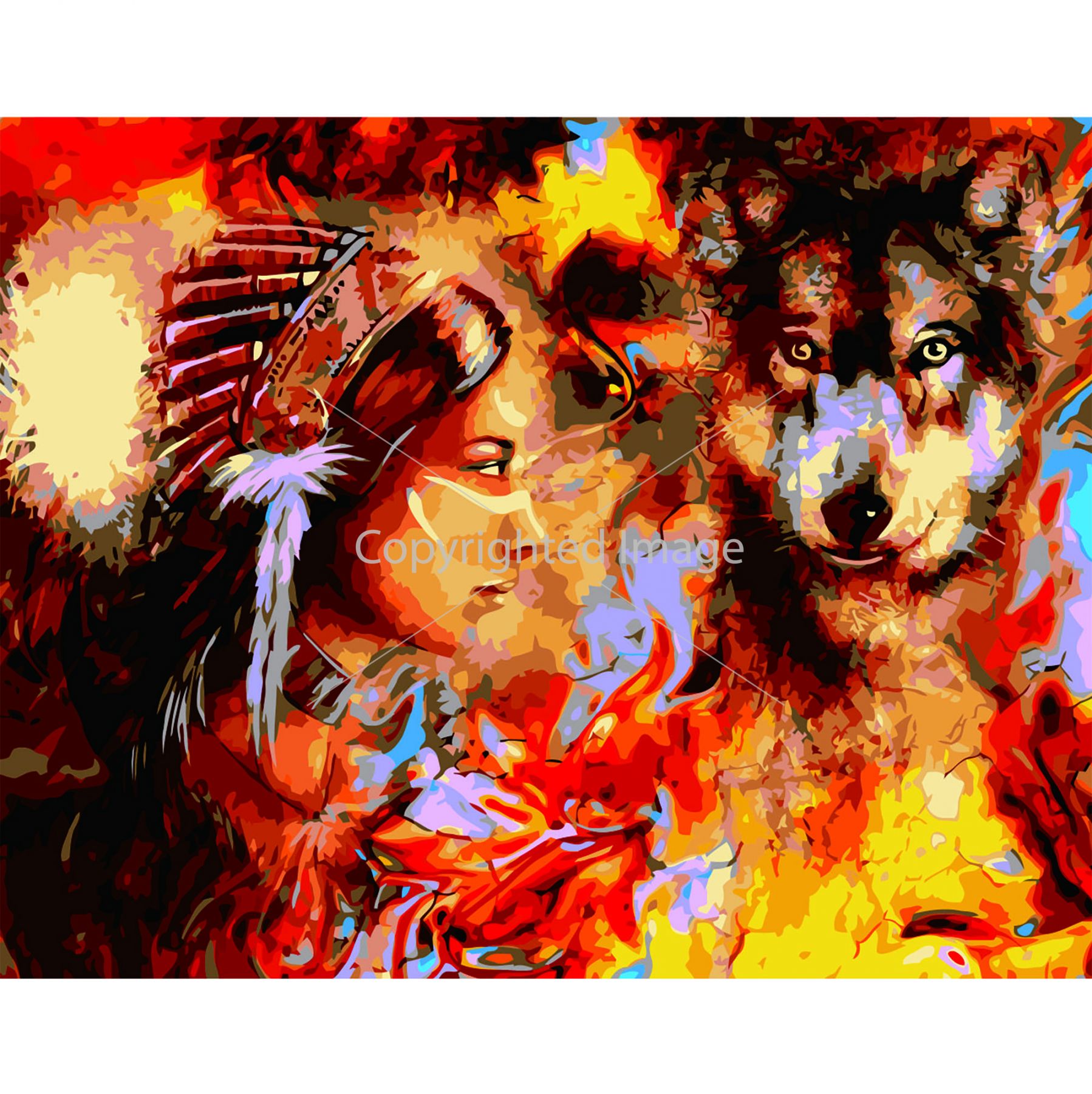 Картина за номерами Strateg ПРЕМІУМ Жінка-команчі з вовком з лаком розміром 40х50 см VA-2519