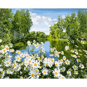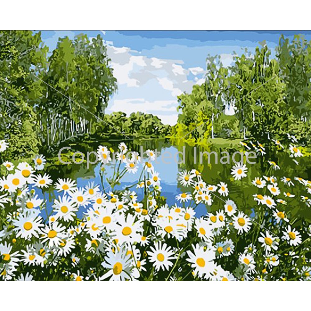 Картина за номерами Strateg Ромашки на березі річки на кольоровому фоні розміром 40х50 (GS1631)