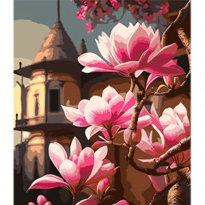 Картина за номерами Strateg Сакура на фоні китайської пагоди на кольоровому фоні розміром 40х50 см (MZ066)