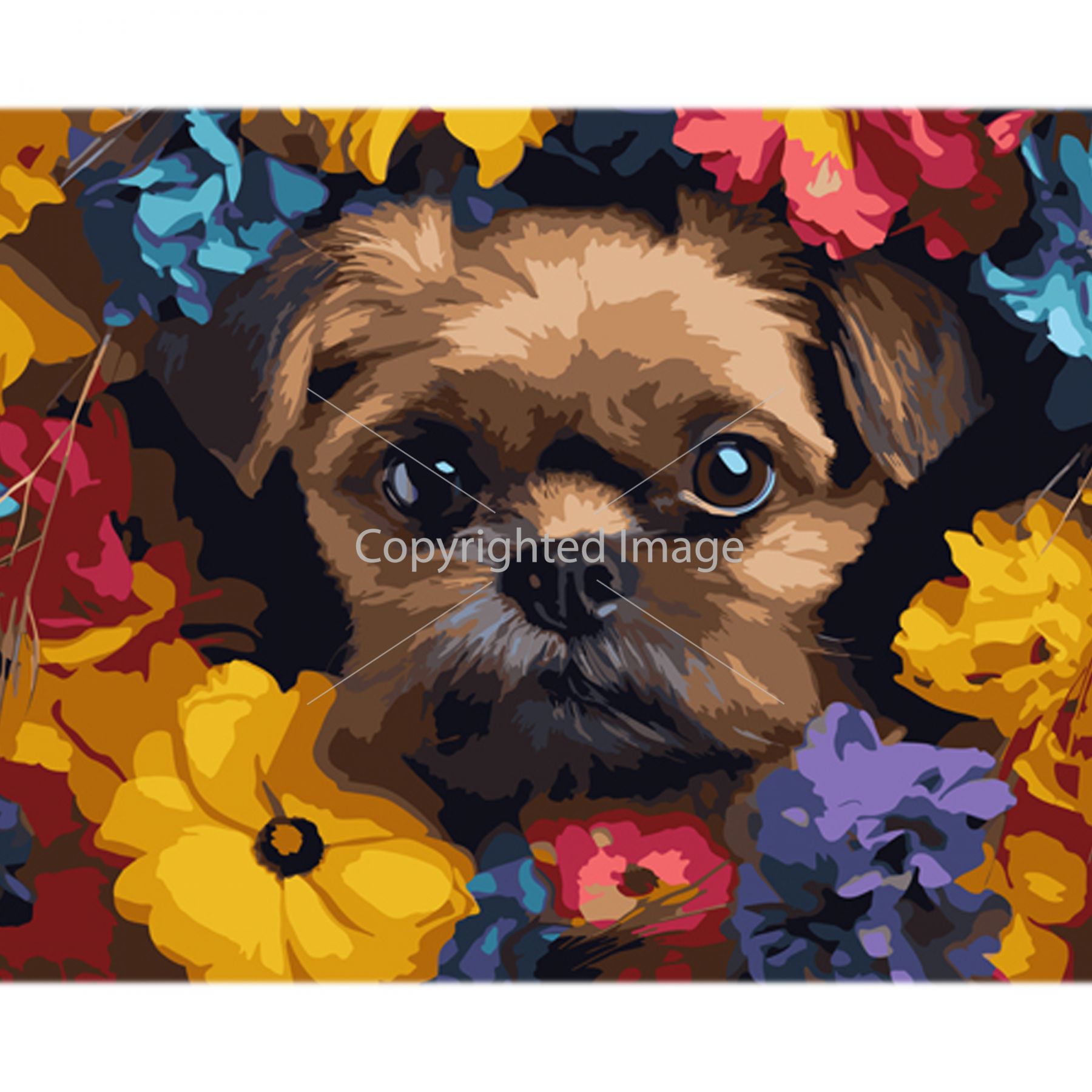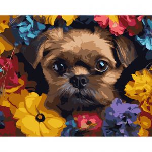 Картина за номерами Strateg Щеня в квітах на кольоровому фоні розміром 40х50 см (MZ016)
