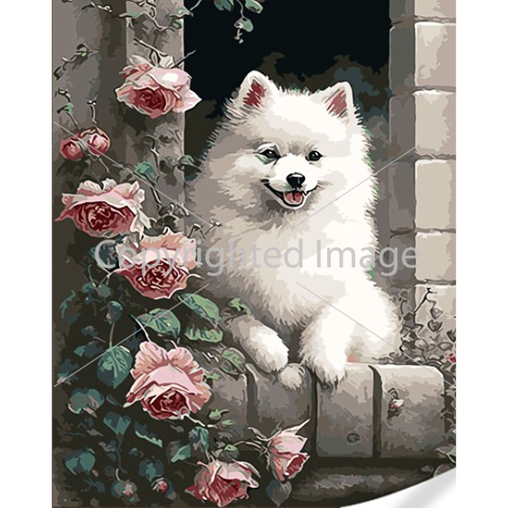 Картина за номерами Strateg Шпіц на підвіконні на кольоровому фоні розміром 40х50 (GS1630)