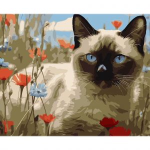 Картина за номерами Strateg Сиамська кішка серед польових квітів на кольоровому фоні розміром 40х50 см (MZ027)