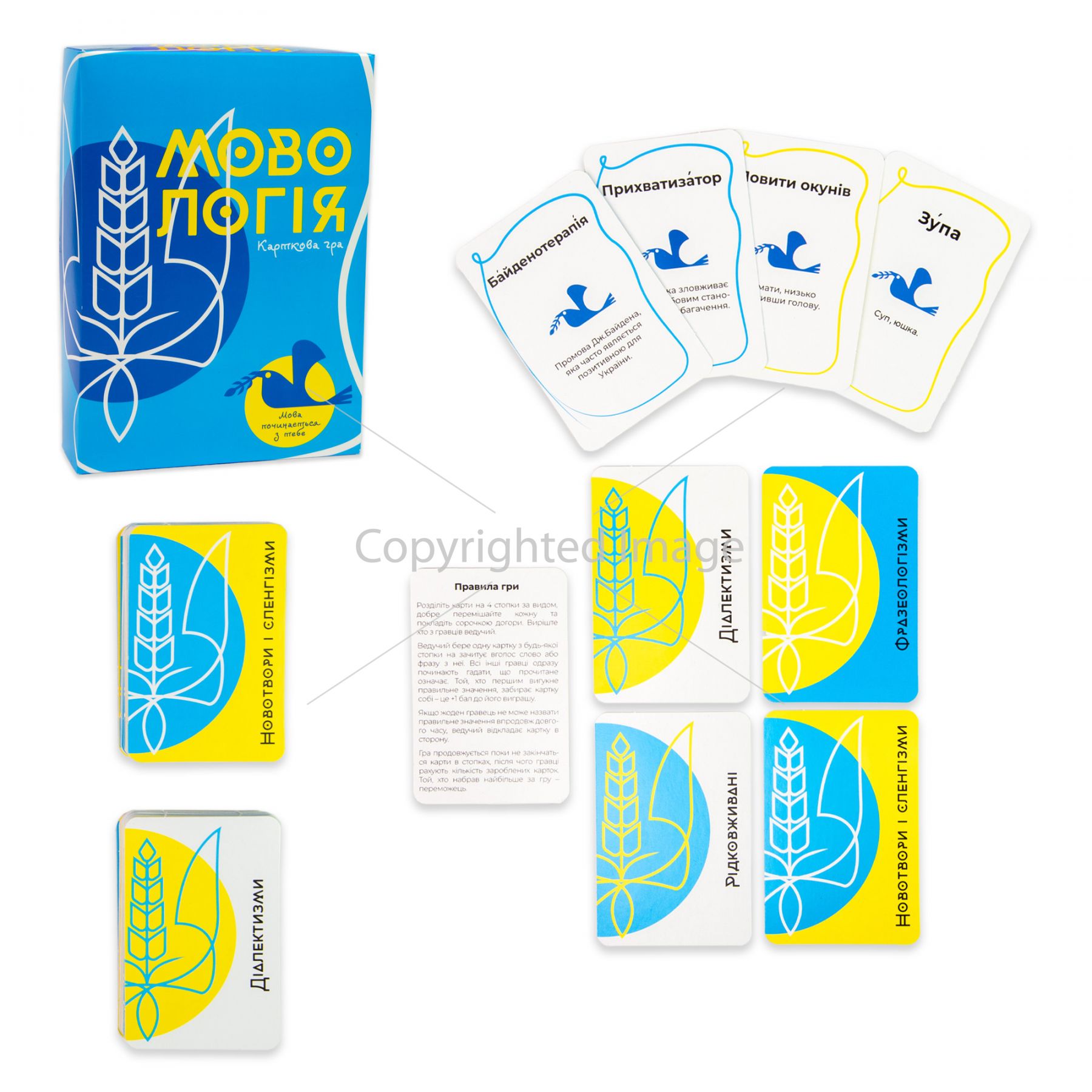 Мовологія - настільна гра, де представлено усе багатство нашої української мови. Ви зустрінете різноманітні фразеологізми, новотвори, рідковживані слова та діалектизми з усіх куточків України. За допомогою цієї гри ви зможете значно збільшити свій словниковий запас та ще ближче познайомитися з різноманіттям рідної мови.