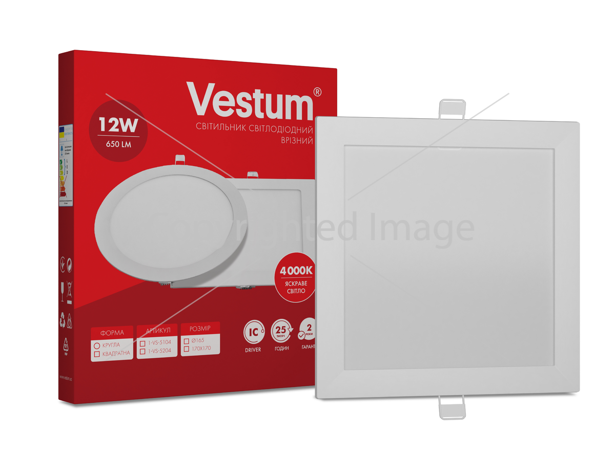 Квадратний світлодіодний врізний світильник Vestum 1-VS-5204 потужністю 12 Вт дає 650 Лм світла. Споживаючи в рази менше електрики, ніж лампи розжарювання або люмінесцентні лампи, світильник дає таку ж кількість світла і прослужить в кілька разів довше. Панель з допомогою кліпс встановлюється в підготовлений заздалегідь отвір. Завдяки конструкції, панель має низький рівень відблисків згідно стандарту UGR19.