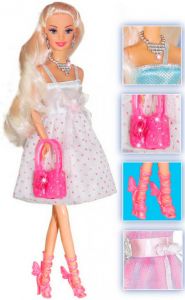 Комплектація:Лялька, 3 сукні, 2 пари взуття, сережки, кольє, сумочка для ляльки