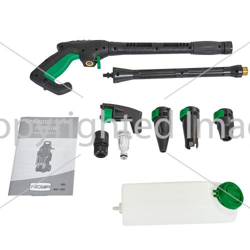 В комплектацію Nowa MW-180r входить: пістолет високого тиску, подовжувач з розпиленням, шланг (8 м),фільтр-перехідник для підключення вхідного шлангу, голка для прочищення форсунок.