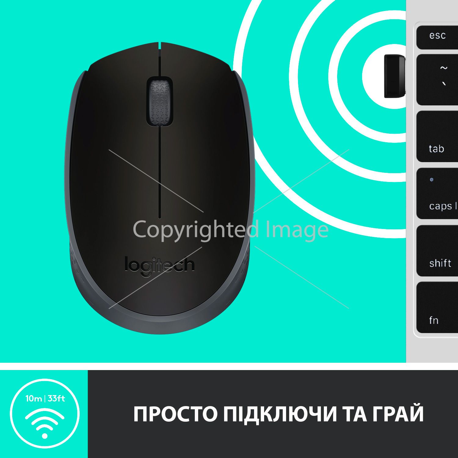 Бездротова миша Logitech M171 поєднує в собі зручність бездротового під'єднання і надійність дротового з'єднання. Завдяки використанню вдосконаленої бездротової технології зв'язку на частоті 2.4 ГГц від Logitech діапазон дії мишки становить 10 метрів. Налаштувати її дуже легко — просто вставте мініатюрний бездротовий приймач в USB-слот. Миша M171 не потребує з'єднання та встановлення програмного забезпечення.