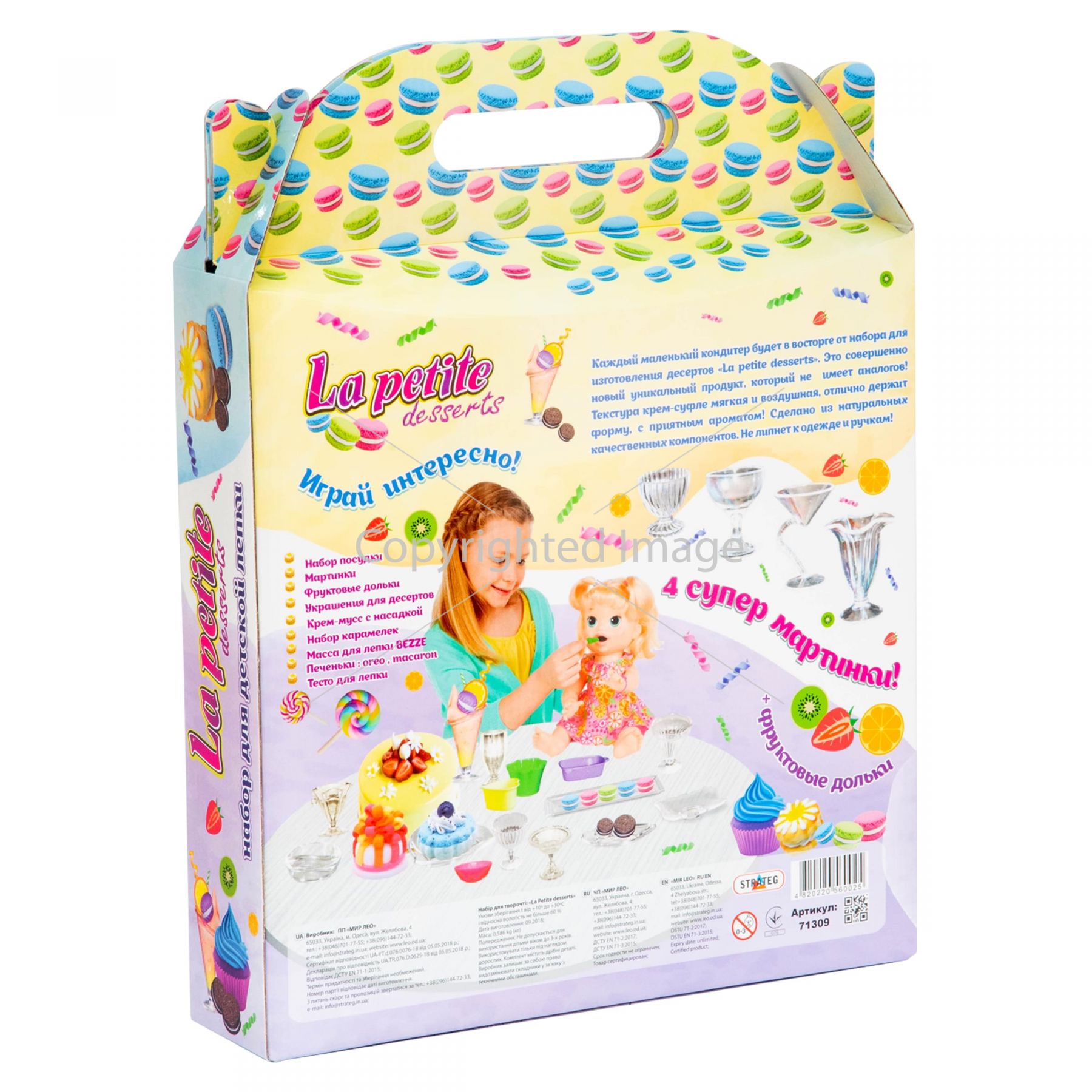 Поєднати розвага з творчістю, розвинути фантазію і художні здібності малюкам допоможе набір "La petite desserts ". Ваш малюк любить тістечка та солодкі ласощі, і йому подобається пригощати ними друзів? За допомогою набору він зможе створити частування з паризьким шармом . Зі спеціальної, м'якої, повітряної маси Bezze і скульптурного тіста можна виліпити масу неповторних французьких солодощів, прикрашених декоративними елементами, які є в наборі. Немає обмежень у творчості - необхідна тільки фантазія! Для сервіровки тістечок і десертів передбачена велика кількість різноманітного посуду - вазочок, келихів , чашок, виделок і ложечок. Для зручності використання крем-мус упакований в кульки з фігурними насадками. Маса для ліплення Bezze дуже пластична, різні кольори легко змішуються, вона не забруднює руки і може приймати будь-яку форму.Повністю твердне, зберігаючи виліплену форму, при кімнатній температурі за 24 години.