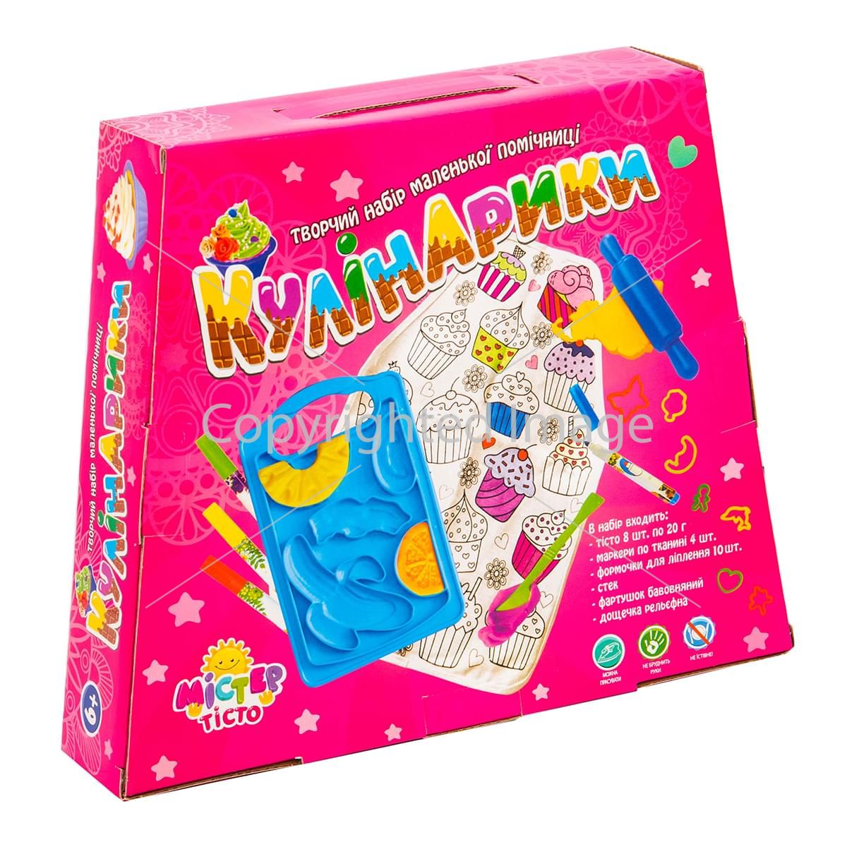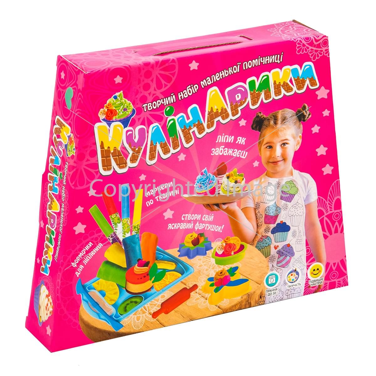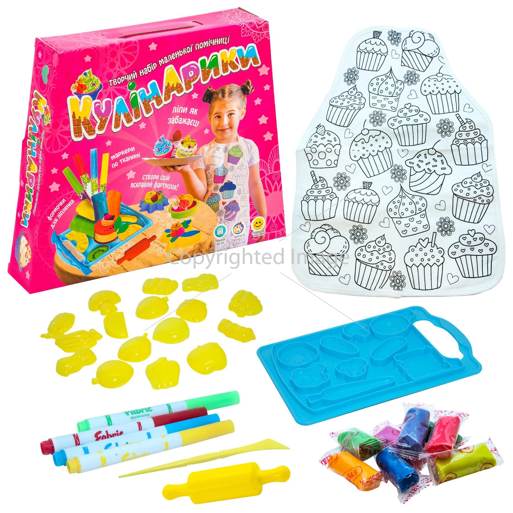 Відмінний набір для маленької господині« Кулінарики ». З його допомогою малюк зможе створити велику кількість різних видів тістечок і солодощів для частування друзів. Основна особливість набору - господиня може оформити фартушок, який є в наборі, в своєму стилі. Для цього передбачені спеціальні маркери для малювання по тканині. Незвичайні і привабливі вироби допоможуть відтворити різні формочки, в тому числі об'ємні 3D і кухонне приладдя. Спеціальна кухонна дощечка з формочками для зручності готування. В інструкції наведені зразки виробів.