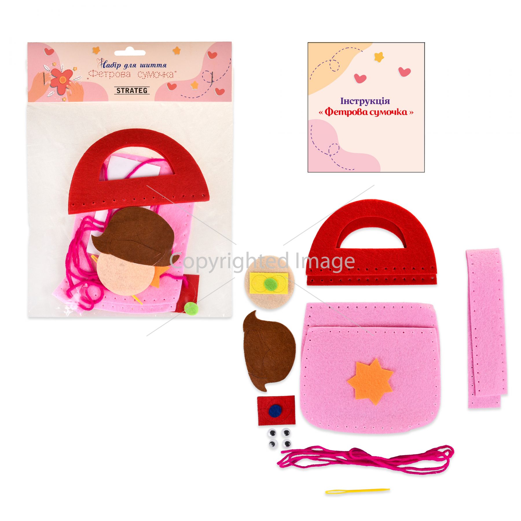 Комплектація: фетрова основа для сумки, елементи з фетру, декоративні елементи, нитки, пластикова голка.