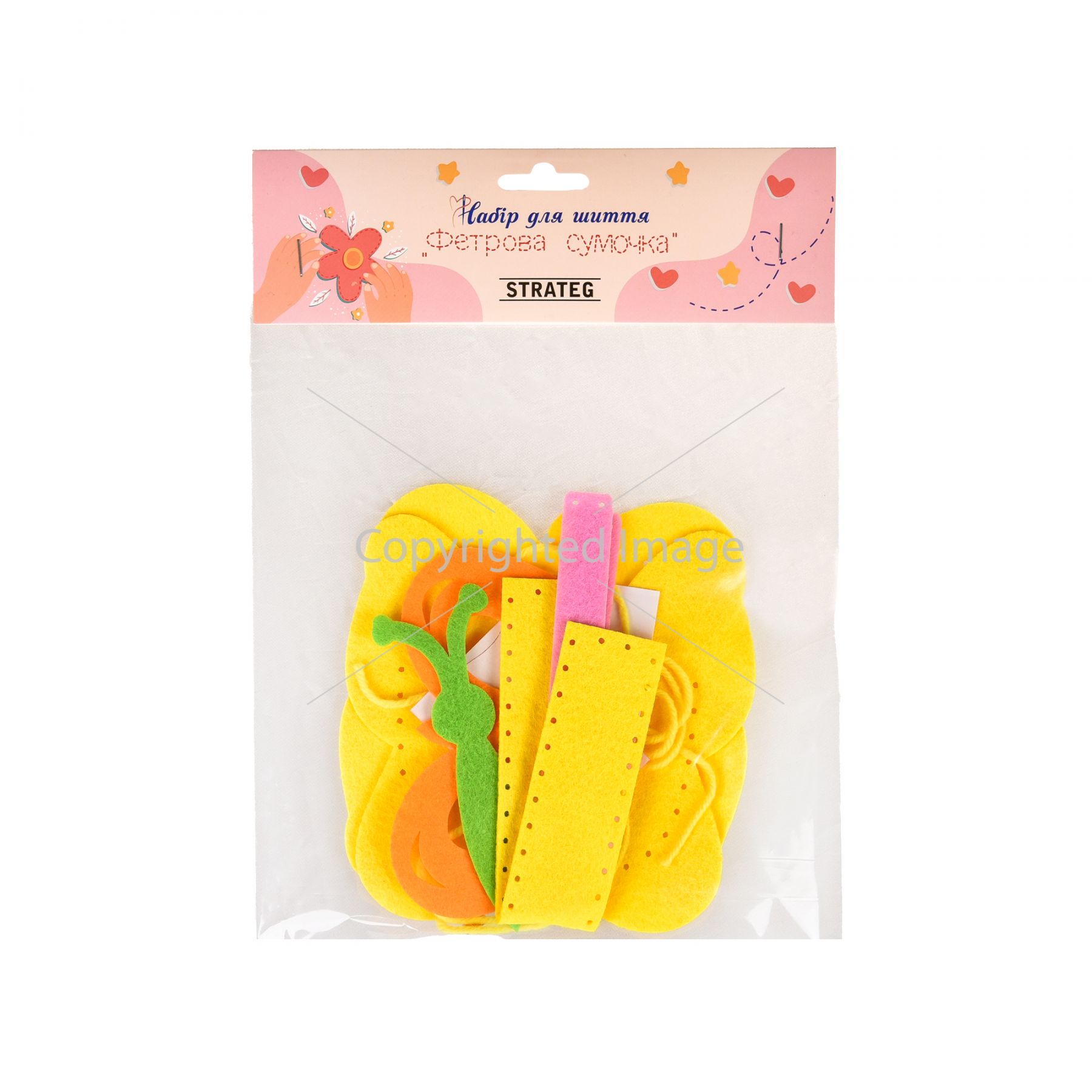 Комплектація: фетрова основа для сумки, елементи з фетру, декоративні елементи, нитки, пластикова голка.