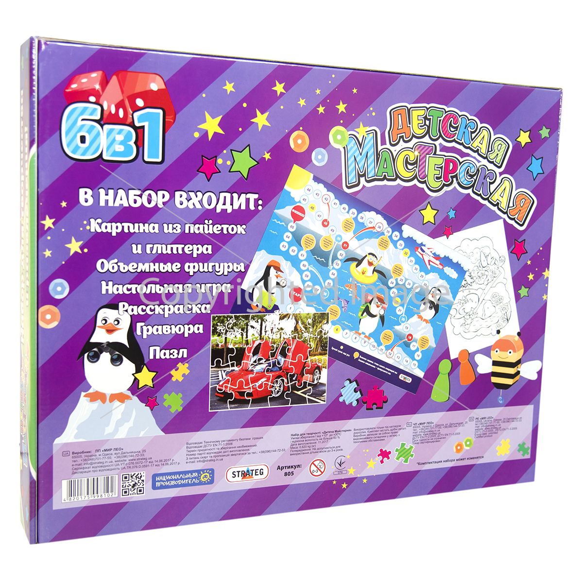 Комплектація:Настільна гра, гравюра, пазл, розмальовка, картина з гліттера та паєток, об'ємна фігура