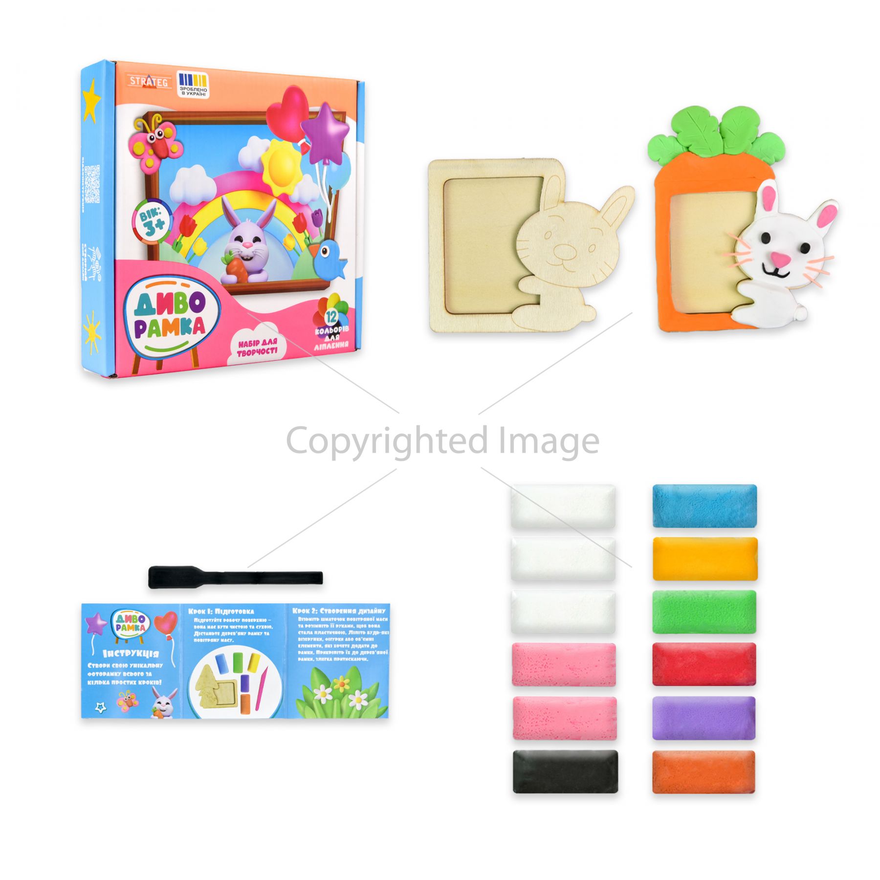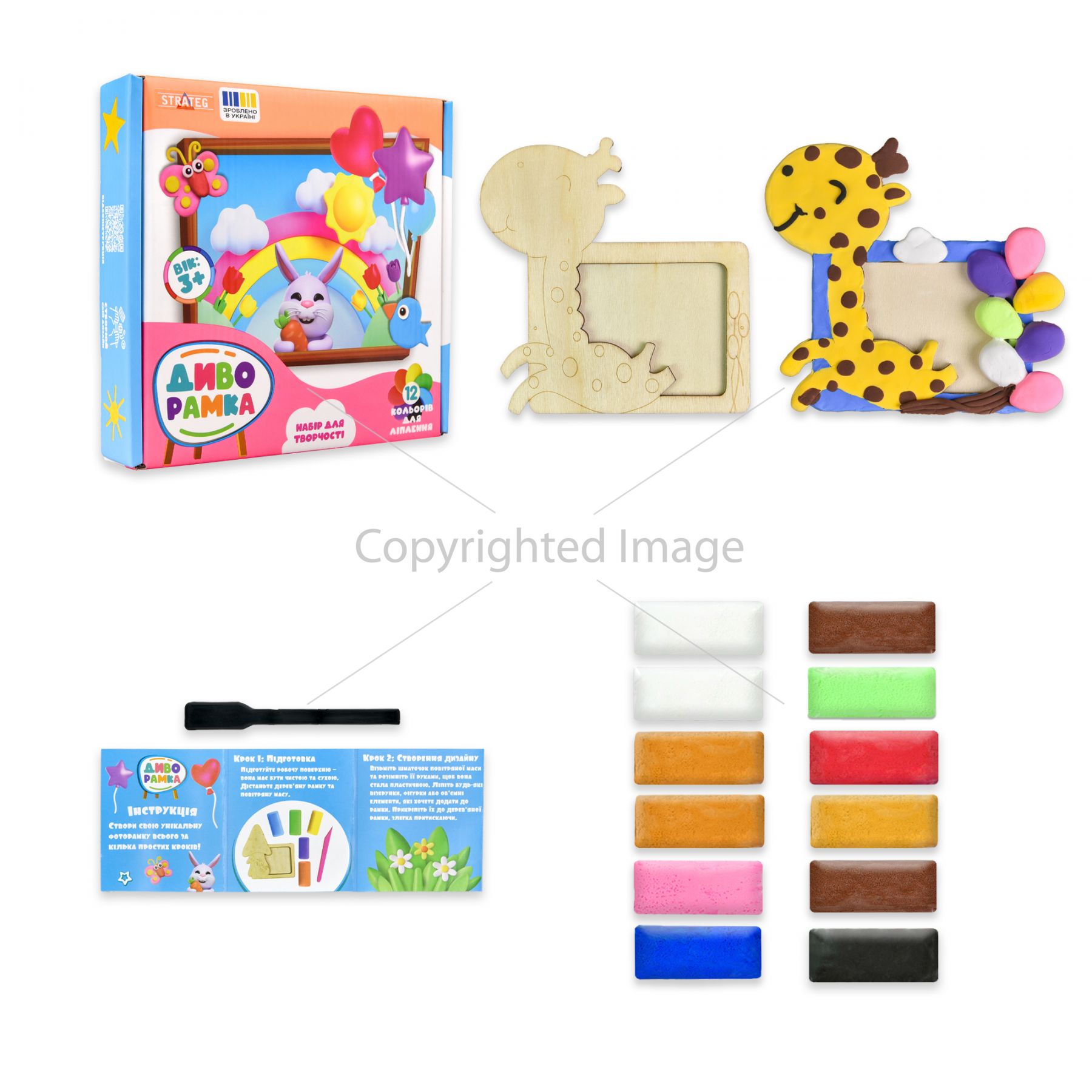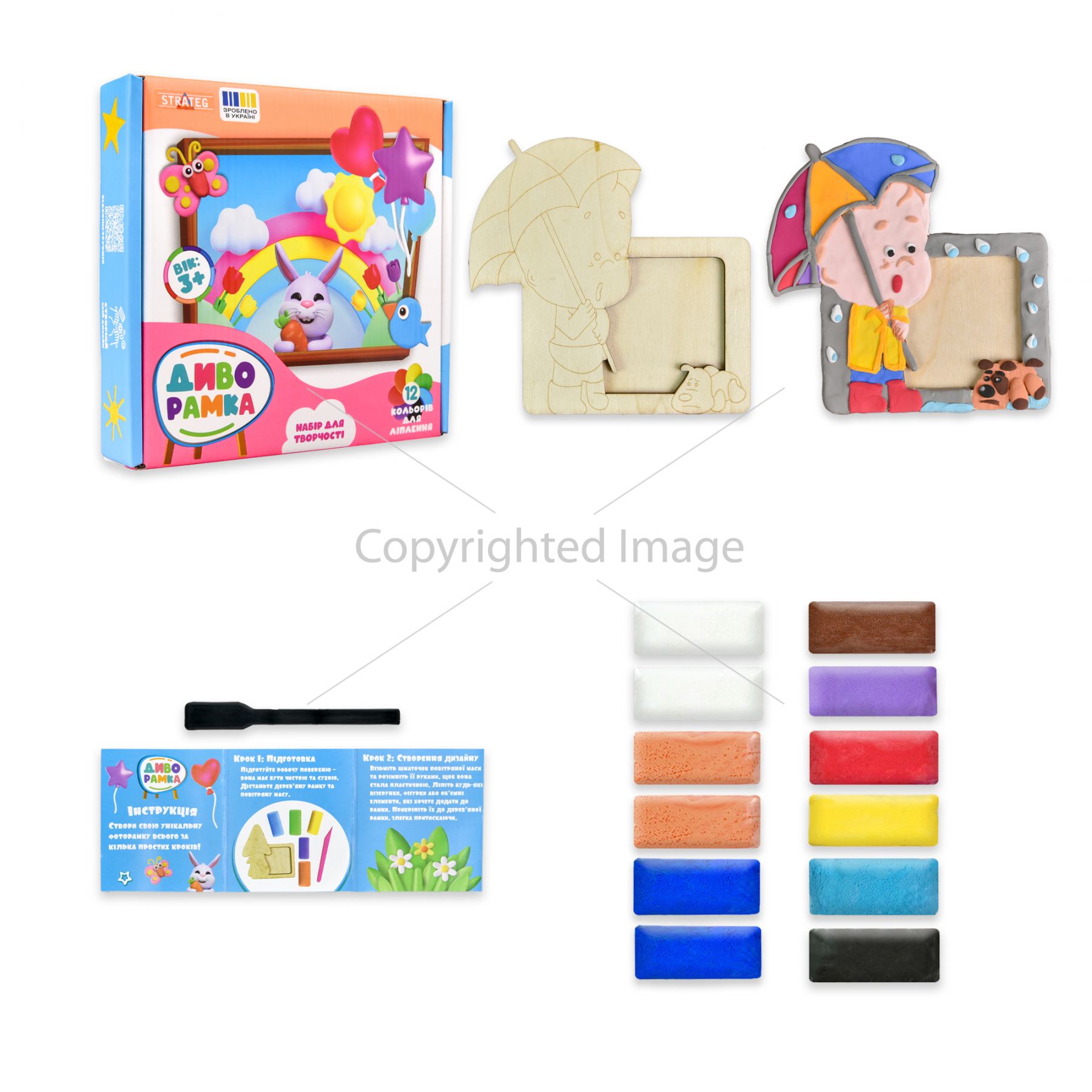 Комплектація: коробка (виготовлена з картону), маса для ліплення - 12 шт., стек (виготовлений з пластику), рамка (виготовлена з фанери), інструкція (виготовлена з паперу).