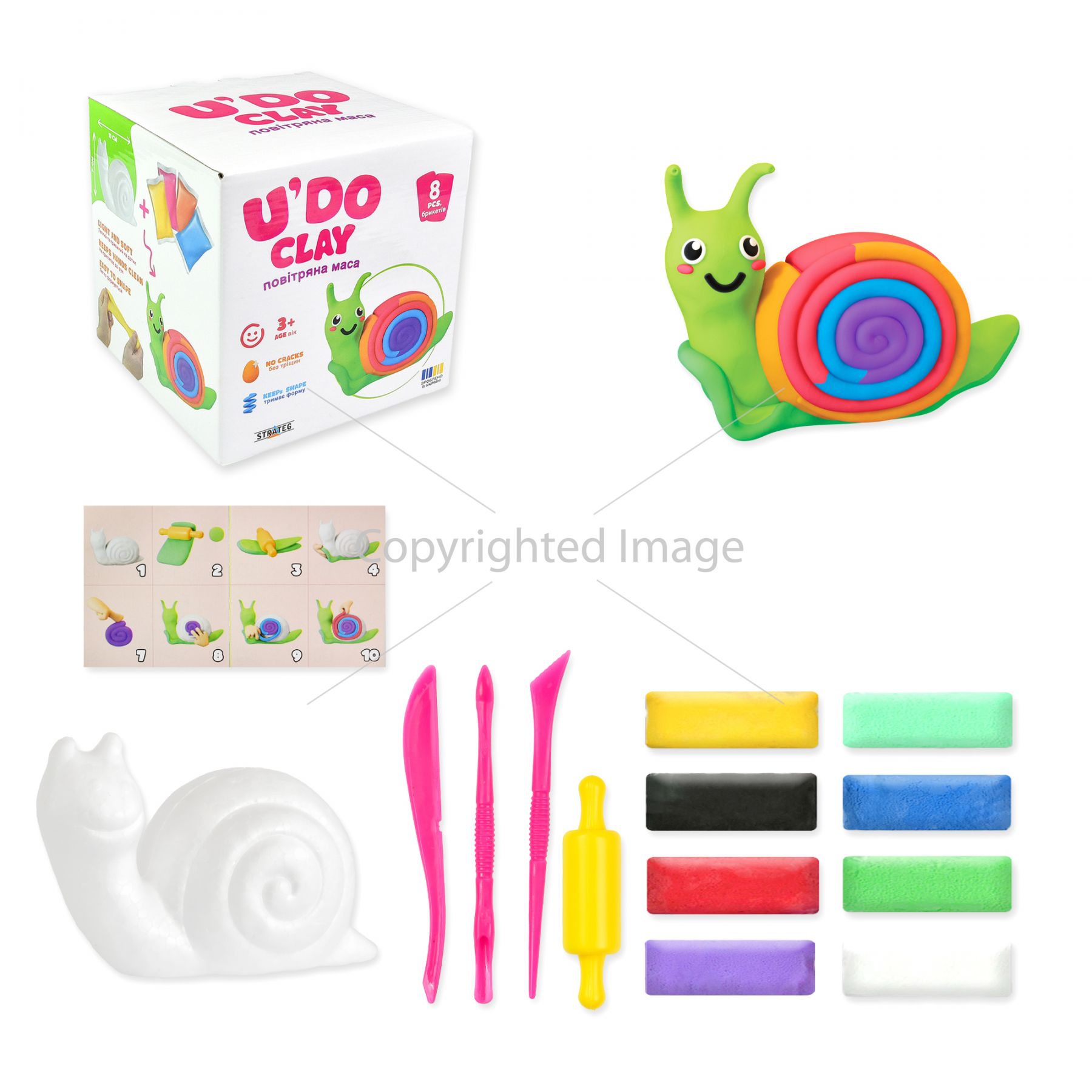 ♦ Комплектація: коробка, маса для ліплення - 8 шт., інструменти - 4 шт., основа для ліпки, пакети з застібкою - 3 шт., інструкція