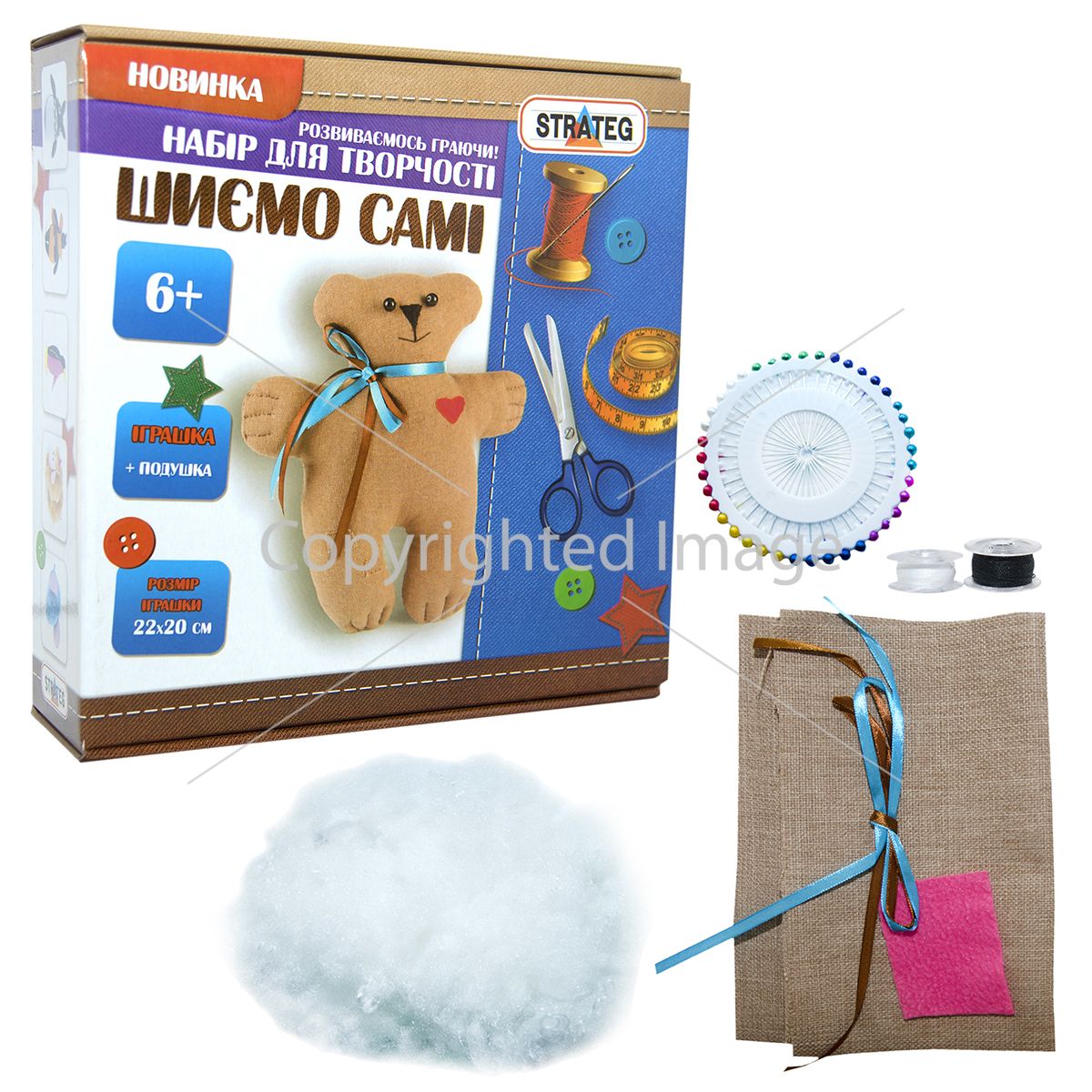 Комплект: тканина, наповнювач, приладдя для шиття, форма, інструкція;