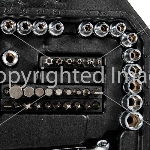 Розмір 1/2 ": шестигранні головки (19 шт), зіркоподібні головки Е профіль (5 шт), тріскачка 45T (1 шт), подовжувач (2 шт), шарнір карданний (1 шт), свічкові головки (2 шт), перехідник з отвором 3/8 "(1 шт), комірець з шарніром (1 шт), комірець Г-подібний (1 шт).