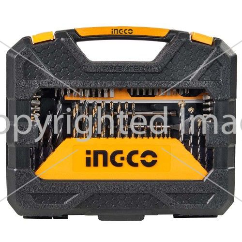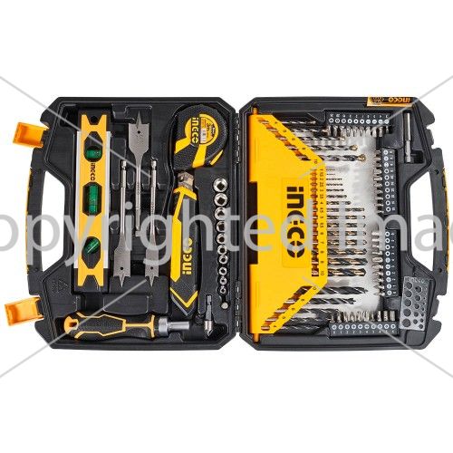 Набір налічує велику кількість необхідних предметів, а саме: свердла по бетону (5 шт), спіральні свердла по металу HSS (15 шт), спіральні свердла по дереву (5 шт), свердла по дереву перові (3 шт), тримач бітів (1 шт), насадки-біти для викрутки довжиною 25 мм (40 шт), зенковка 12 мм (1 шт), магнітний хвостовик (1 шт), вимірювач діаметру свердла (1 шт), міні-рівень спиртовий (1 шт), ніж зі змінним лезом (1 шт), головки торцеві змінні 1/4" (10 шт), рулетка вимірювальна 3 м (1 шт), перехідник 4-6 (1 шт), ручка з тріскачкою (1 шт).