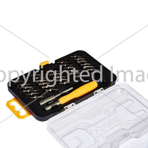 У набір входить 30 біт 4х28 мм розмірів: SL1.5, SL2, SL2.5, SL3, SL3.5, SL4, PH000, PH00, PH0, PH1, T4, T5, T6, T7, T8, T9, T10, T15, T20, H0.9, H1.3, H1.5, H2, H2.5, H3, H4, Y2, U2.6, а також п'ятикутна зірка 0.8 і 1.2, шліц яких підходить для iPhone та iPad.
