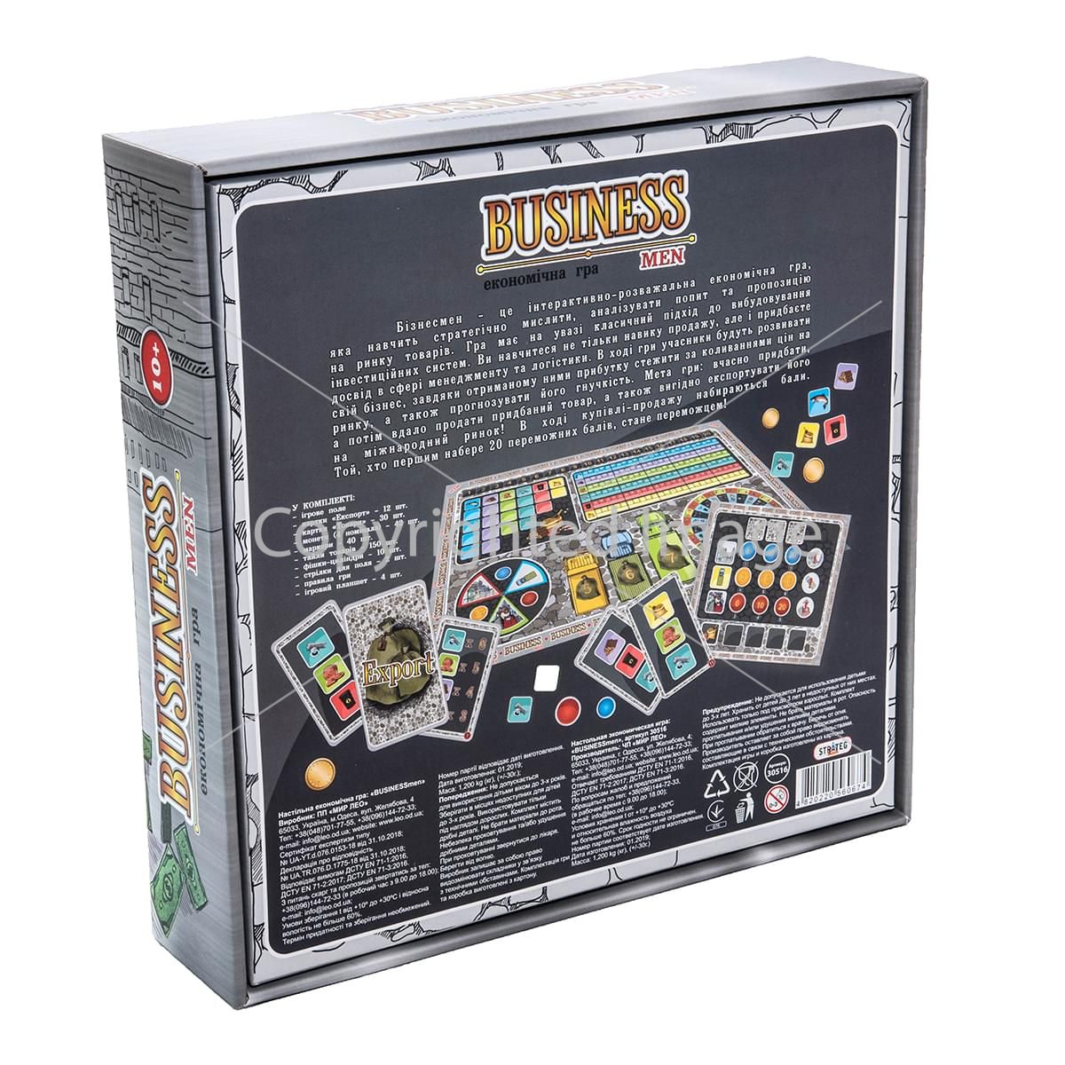 Настільна гра «BUSINESSmen» Strateg (30516) схожа на відому гру «Монополія», але відрізняється від неї. Тут учасники використовують товари для розвитку свого бізнесу, забезпечують купівлю, продаж, доставку та експортні операції. Інтерактивна розважально-навчальна гра познайомить з основами економіки капіталізму, навчить аналітиці, покращить стратегічне мислення та вміння передбачати наслідки своїх дій. Перед початком гри ознайомтеся з правилами, виберіть ігрові планшети, розділіть картки та валюту. Переможе найкмітливіший. ♦ Вік: 10+ ♦ Комплект: ігрове поле, 4 планшети, 32 картки товарів, 150 фішок товарів, 42 монети, 40 маркерів, 2 стрілки-покажчики, 10 фішок, кубик. ♦ Кількість учасників: 2-6 Мова: українська.