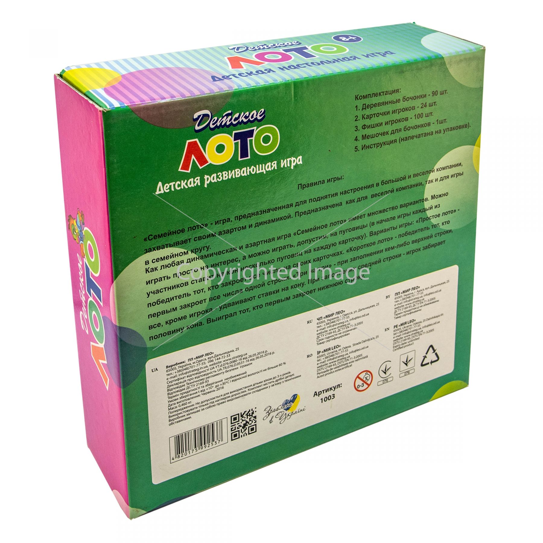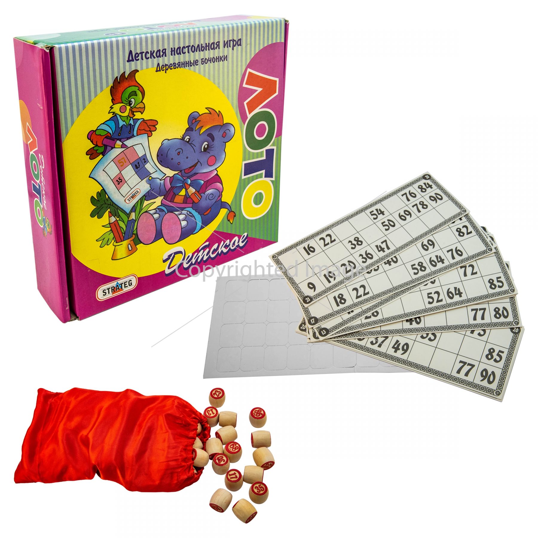 Лото «Дитяче» створено в кращих традиціях свого жанру. У комплекті 24 ігрові картки, дерев'яні барильця з цифрами в мішечку, гральні фішки. Залежно від ваших уподобань ви можете вибрати будь-який з варіантів гри – заповнення однієї картки, заповнення двох карток, заповнення рядка і так далі. Також дійові особи визначають формат гри: на інтерес або ж з призовим фондом, що, звичайно ж, додасть грі азарту і зробить її більш насиченою.