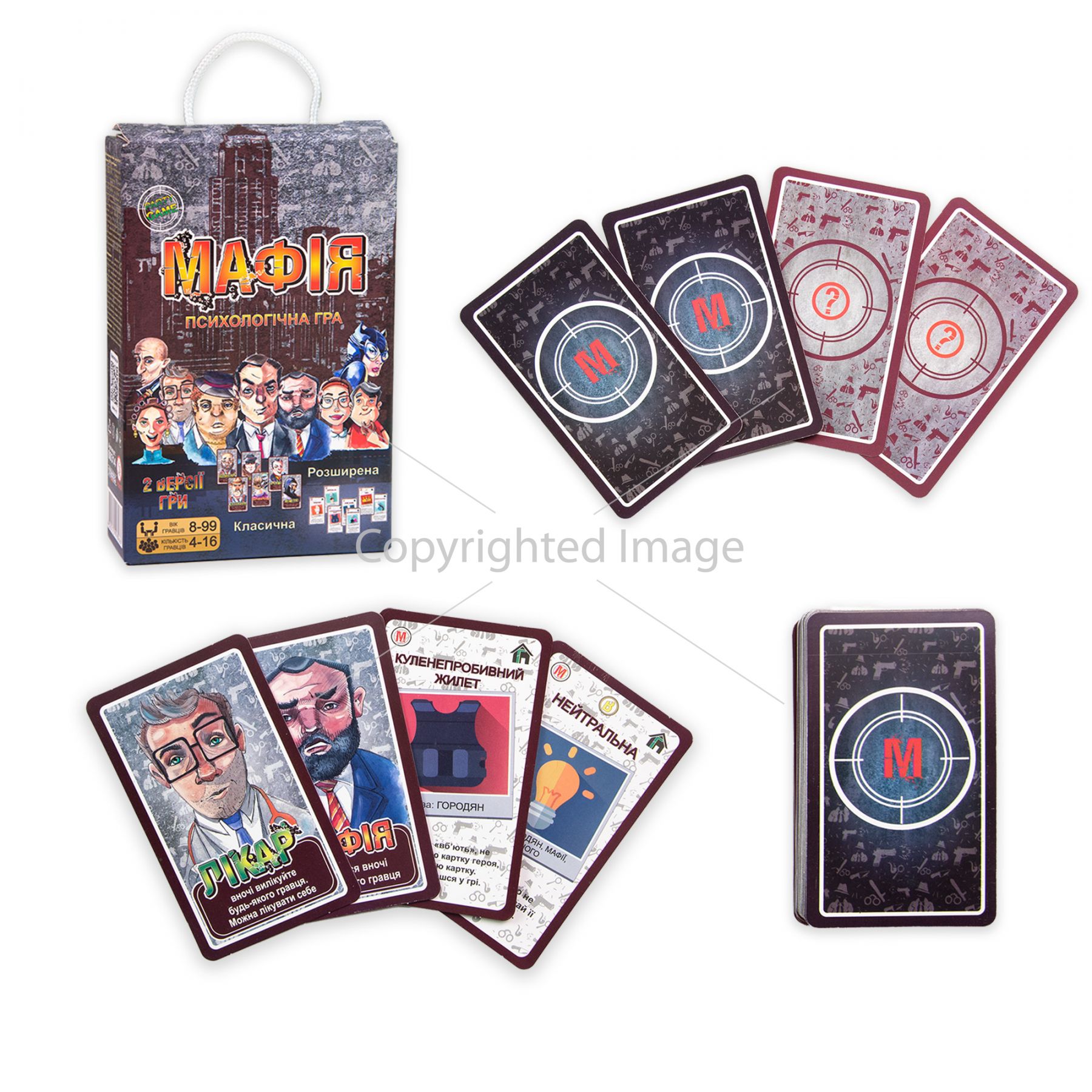 «Мафія» – відома рольова гра з психологічним нахилом, яка додасть у будь-який вечір Веселощів та гостроти. Граючи в неї, можна краще дізнатися про своїх друзів і навчитися якісніше розпізнавати емоції. Все найцікавіше починається після вибору ведучого та розподілу ролей. Гравці стають учасниками давньої сутички зла (мафії) та добра (мирних жителів). А хто переможе – залежить від кожного. Запропонована комплектація дозволяє вибирати різні варіанти гри, будь то класична гра або розширена. А якщо ви граєте вперше або забули правила – допоможе інструкція, в якій все детально описано. Гра розвиває швидкість мислення та обробки інформації, логічне мислення, вміння аналізувати й уважність. ♦ Вік: 8+ ♦ Комплект: 16 карток з персонажами (1 ведучий, 3 мафіозі, 1 перевертень, 1 маніяк, 1 жінка-кішка, 1 ніндзя, 1 лікар, 1 комісар, 1 детектив, 1 шпигун, 4 мирні мешканці), 26 карток дій та інструкція. ♦ Матеріал: картон. ♦ Кількість гравців: 8-16 Мова: українська.