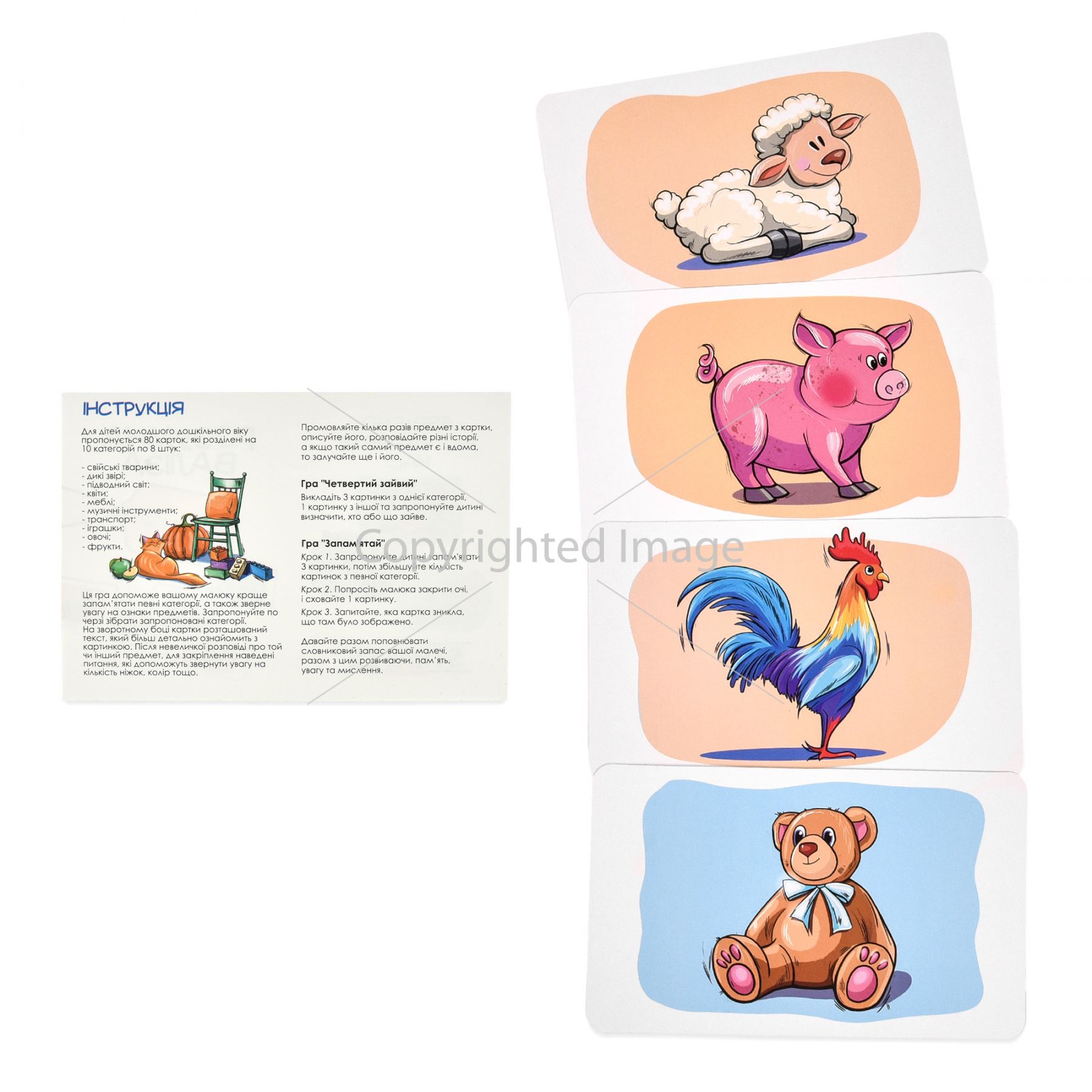 Комплектація: коробка (виготовлена з картону), картки - 80 шт. (виготовлені з картону), інструкція (виготовлена з паперу).