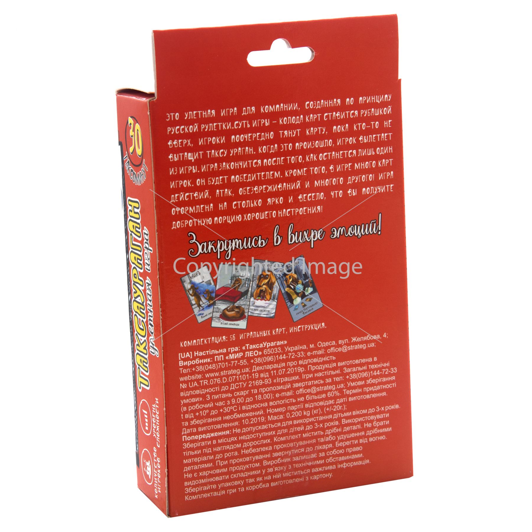 Весела розвага для компанії – настільна гра «Таксаураган» (Strateg 30351) дасть змогу захоплююче провести час усій родині та при цьому розвинути навички спілкування. Являє собою різновид гри на вибуття – пес такса буде провідником у цій розвагі. В наявності 56 ігрових карт із зображеннями різних кумедних картинок та ситуацій, а також кілька карт із зображенням Такси. Карти розміщуються на столі сорочками вгору, гравці по черзі беруть карти - кому дісталося зображення Такси, що вибуває з гри. Перемагає той гравець, який залишиться на самоті. На решті карт нанесені різні підказки, що допомагають перемогти в грі. ♦ Вік: 10+ ♦ Размір пакування: 15х8,4х3 см ♦ Комплект: 56 карт, інструкція ♦ Кількість учасників: 2-6. Мова українська.