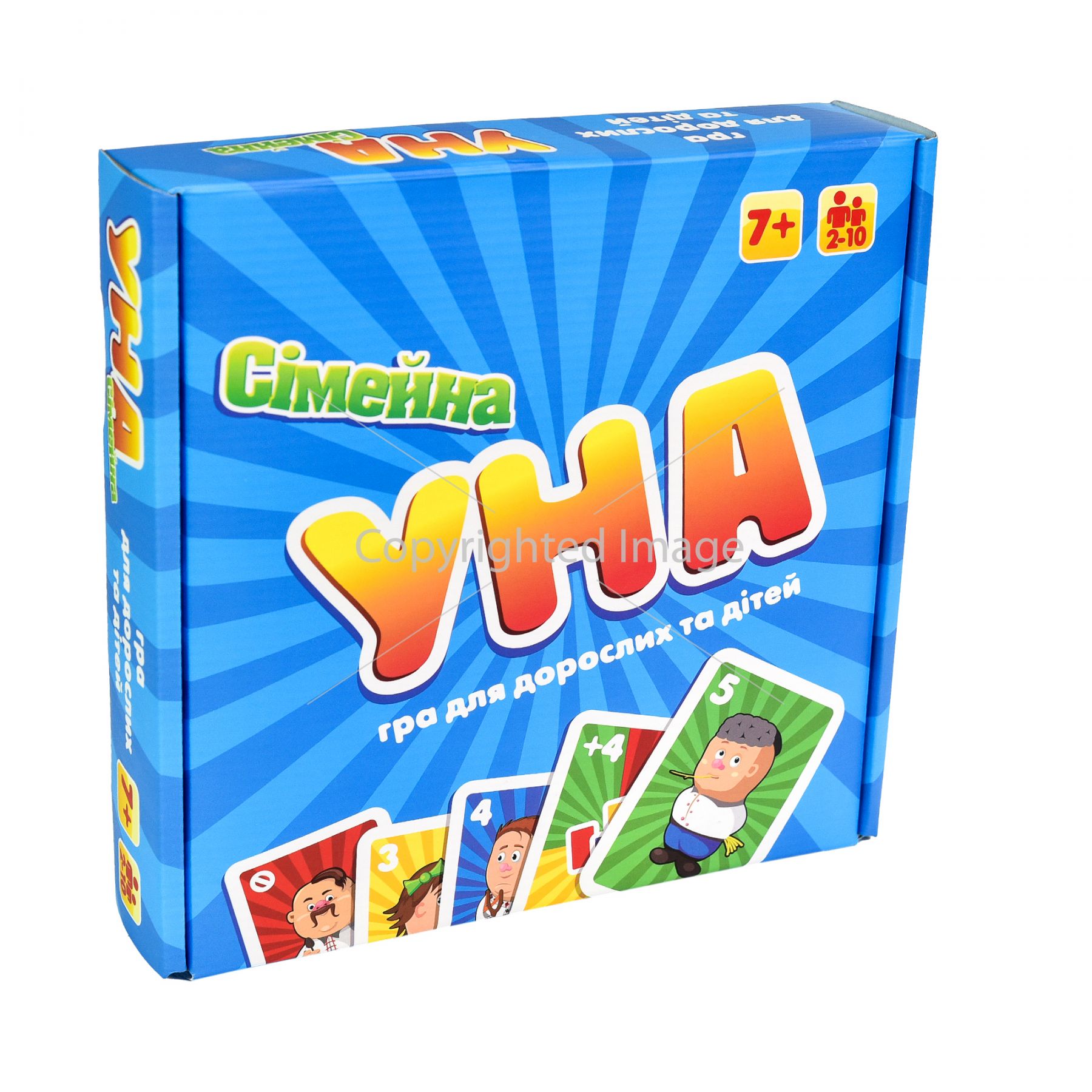 "УНА сімейна" (30527) - цікава та захоплива гра для всієї родини. Правила гри дуже прості. За правилами картку з рук потрібно викласти такого ж кольору або цифри, що і попередня. Цікавості в гру додають бонусні карти, за допомогою яких ви зможете змусити суперника взяти карти, пропустити хід, або одночасно і те, і те.