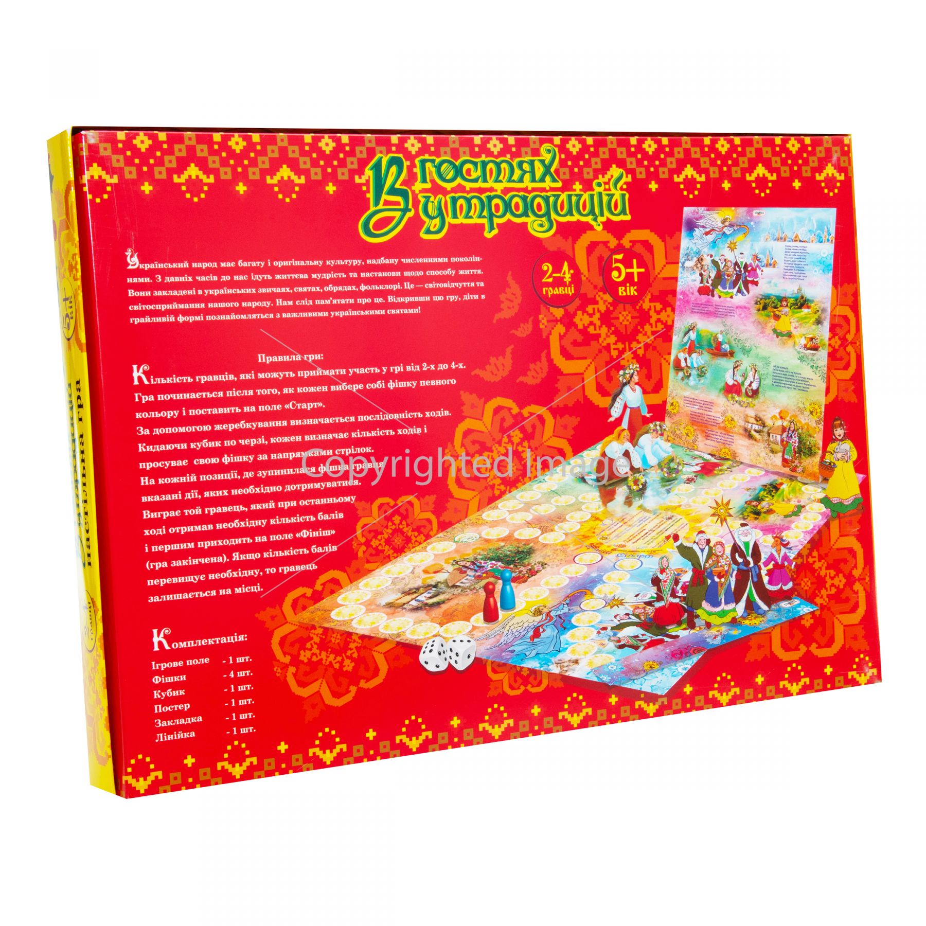 Вивчення різних українських обрядів в ігровому форматі – це все про настільну гру «В гостях у традицій» Strateg (30212). Захопить усю сім'ю та зможе подарувати радісне спільне проведення часу та нові знання. А ще покращить уважність та вміння аналізувати. Учасники встановлюють фішки на початку ігрового поля та пересувають їх відповідно до кількості очок, що випали на кубику. Саме поле – це карта, на якій зображені різні пори року та обряди, пов'язані з ними. Рухаючись нею, вам потрібно виконувати завдання та розгадувати загадки, а також уникати пасток. Якщо гравець правильно виконав завдання – фішку можна пересунути. Перемагає у грі той, хто першим пройде всі пори року та прийде до фінішу. Також у коробці ви знайдете додатковий бонус – лінійку та закладку, які виконані в стилістиці гри. Розмір ігрового поля 42 х 60 см. ♦ Вік: 5+ ♦ Комплект: ігрове поле, 4 фішки, кубик, лінійка, закладка, інструкція. ♦ Кількість учасників: 2-4 Мова українська.