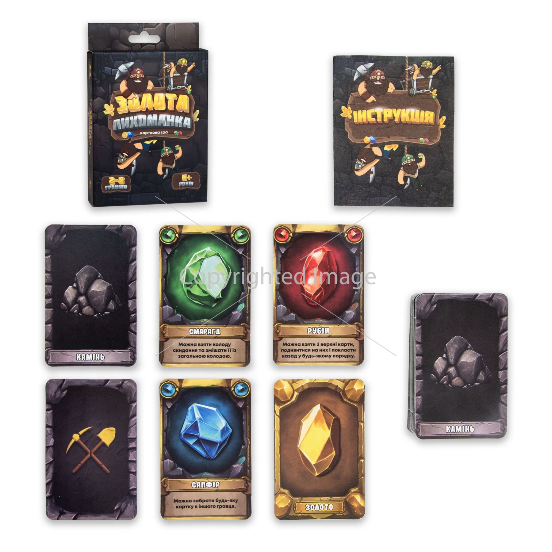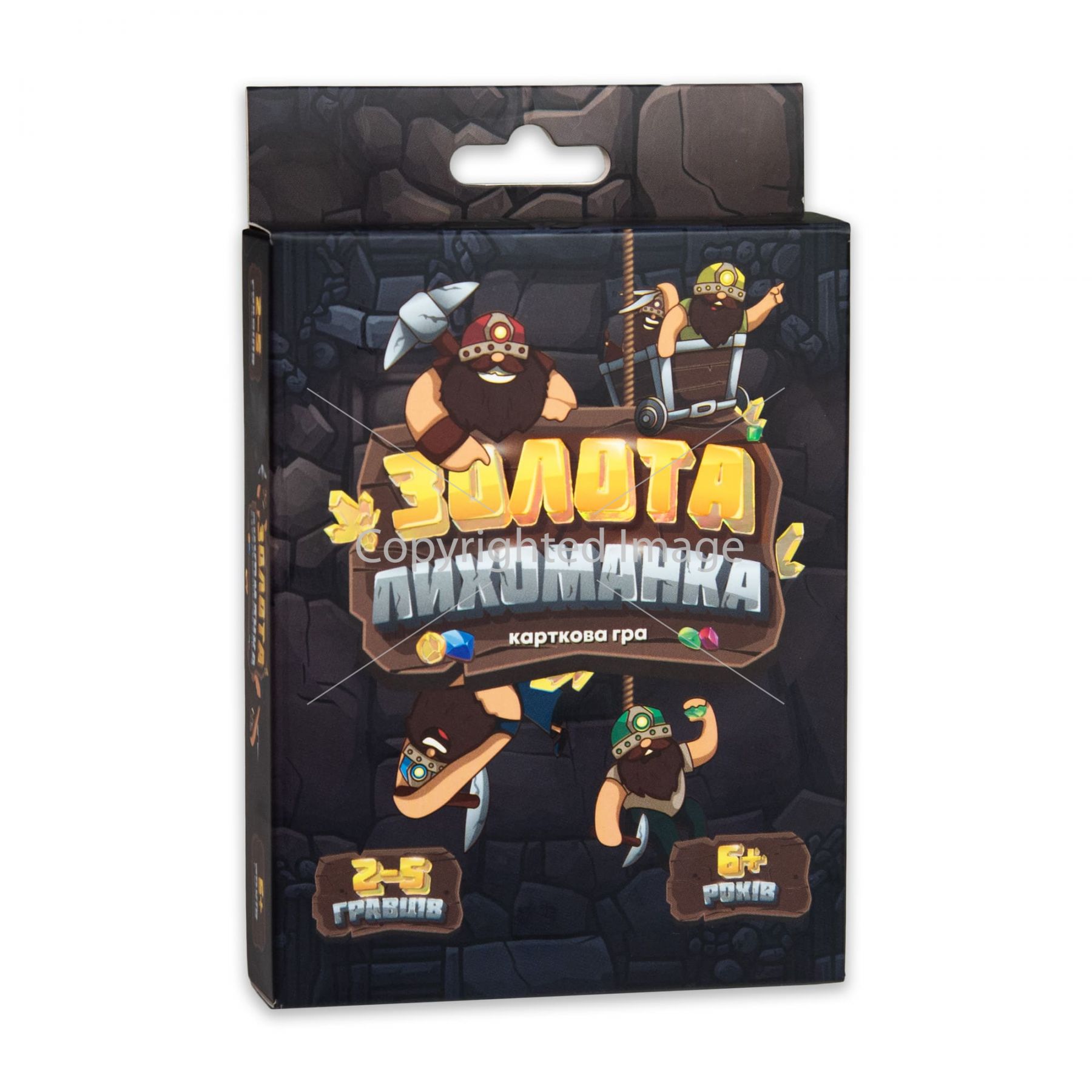 Настільна гра Strateg Золота Лихоманка українською мовою 30396 Приготуйтеся до пригодницького досвіду з грою “Золота лихоманка”! Ця гра – чудовий спосіб провести час з родиною та друзями. Зібравши 3 карти із золотим злитком, ви переможете. Але не все так просто, адже на вас чекають різні камені, які допоможуть або завадять досягти вашої мети. Комплектація гри: картонна коробка розміром 14,3 х 9,2 х 2,2 см, 55 картонних карток, паперова інструкція. Вага гри в коробці: 90 г (+-20 г). Рекомендований вік: від 6 років. Кількість гравців: від 2 до 5. Гра українською мовою.