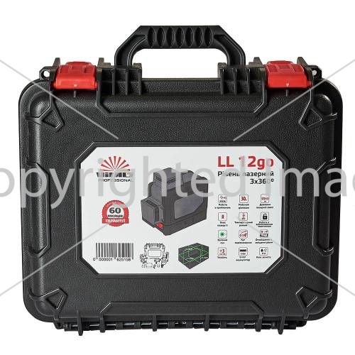 Рівень лазерний Vitals Professional LL 12go являє собою професійний лазерний рівень для побудови горизонтальних і вертикальних ліній. Ця модель проєктує горизонталь 360° та дві вертикалі 360°. Під час виробництва нівеліра використовується високоякісний діод торгової марки «Osram», який виробляється в Німеччині.