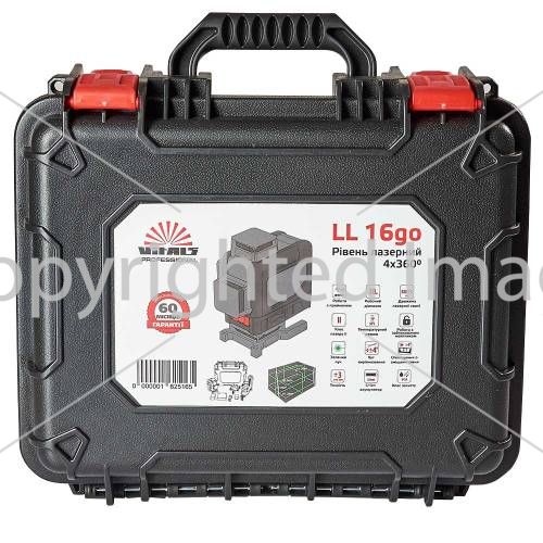 Рівень лазерний Vitals Professional LL 16go являє собою професійний лазерний рівень для побудови горизонтальних і вертикальних ліній. Ця модель проєктує дві горизонталі 360° та дві вертикалі 360°. Оскільки в моделі є нижня призма, її можна використовувати для роботи з плиткою та іншими підлоговими покриттями. Під час виробництва нівеліра використовується високоякісний діод торгової марки «Osram», який виробляється в Німеччині.