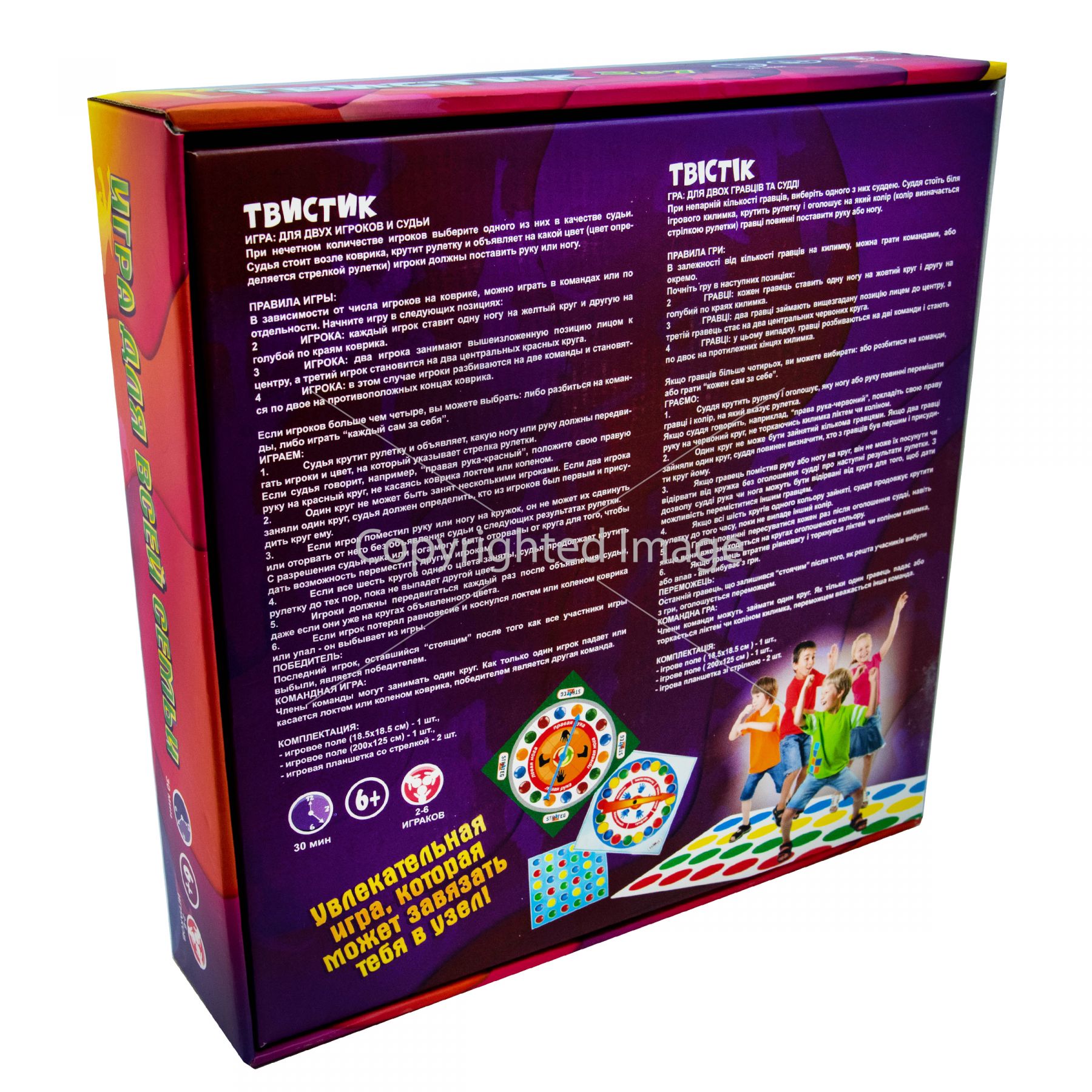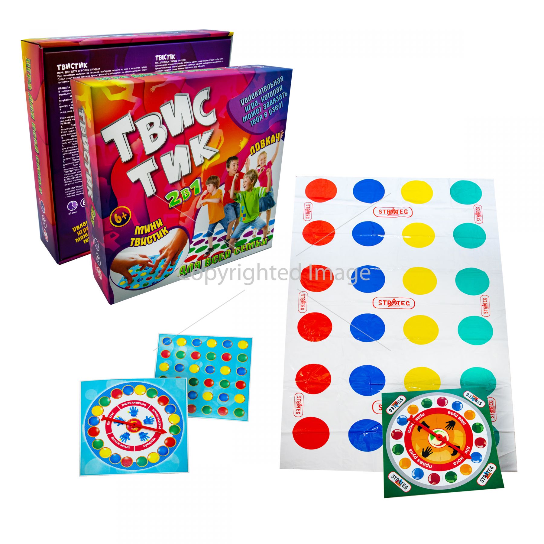 Весела розвага для компанії - гра «ТвісТік» Strateg (30500). Захопить всю компанію і допоможе розвинути пам'ять, уважність, почуття об'єму та спритність. Є різновидом відомої гри «Твістер» у двох варіантах – стандартному, в який можна грати на підлозі, та міні варіанті для гри на столі. Правила гри прості – на підлозі розташовується ігрове поле з нанесеними колами різних кольорів, на які учасник ставить ноги або руки відповідно до кольору, що випав на рулетці. Програє той учасник, який торкнеться підлоги будь-якою частиною тіла, крім ніг і рук. У міні-варіанті ігрове поле малого розміру розташовується на столі та у грі беруть участь пальці рук. Грати можна командами по кілька людей. ♦ Вік: 6+ ♦ Розмір коробки: 30х30х7 см. ♦ Комплект: велике ігрове поле, мале ігрове поле, 2 рулетки, інструкція. ♦ Матеріал: картон, пластик. ♦ Кількість учасників: від 2 до 6. Для гри необхідний ведучий. Гра російською мовою.