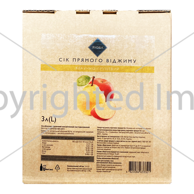 Сік яблучно-грушевий неосвітлений пастеризований 3 л. Прямого віджиму. Склад: сік яблучний 90%, сік грушевий 10%, антиоксидант-кислота аскорбінова. Харчова (поживна) цінність у 100 г продукту: 45 ккал. Харчова (поживна) цінність у 100г продукту: Білки - 0,1 г., Жири - 0,1г. Умови зберігання: зберігати за температури від 0°С до 25°С та відносної вологості повітря не більше, ніж 75%.