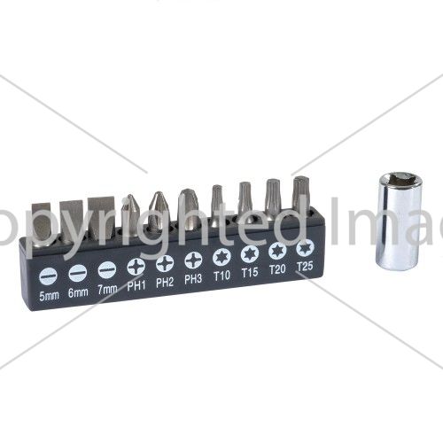 У набір входить ручка з гнучким стрижнем, адаптер для біт на 25 мм, біти з шестигранним хвостовиком 1/4 (10 шт) розміром: SL5, SL6, SL7, PH1, PH2, PH3, T10, T15, T20, T25.