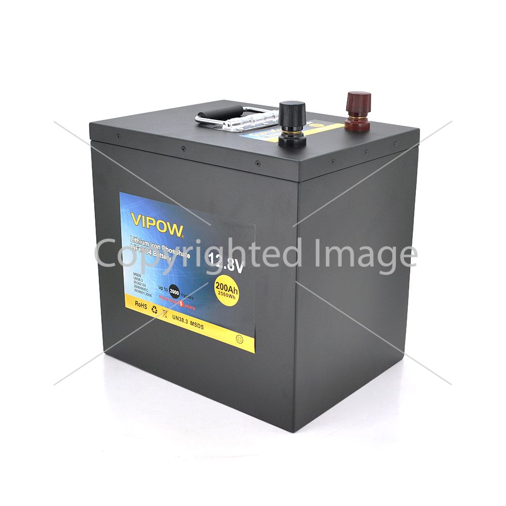 Vipow LiFePO4 12,8V 200Ah — акумуляторна батарея LiFePO4 типу на базі ВМS плати 80A. За ємності 100Ah і робочої напруги 12,8 Вольта акумулятор знаходить своє широке застосування, але найчастіше використовується для джерел безперебійного живлення, для котлів. Гарантований високий ресурс циклів — більш ніж 2000. Високий коефіцієнт безпеки.