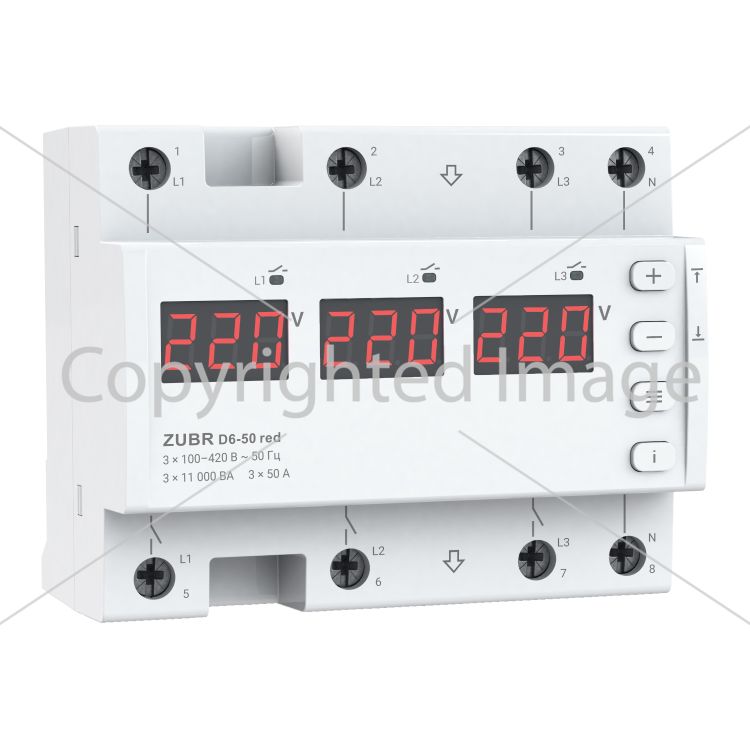 Двухрежимное реле напруги однофазное/трехфазное D6-50 на DIN-рейку, 3*50А, 3*11000ВА, 120-280В, шестимодульне з індикатором напруги (Червоний)