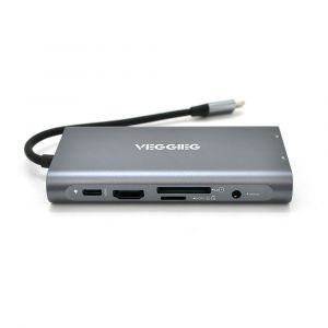 Хаб-конвертор VEGGIEG TC10-U Type-C (тато) на Type-C (мама) + USB3.0 * 3 (мама) + HDMI (мама) + VGA (мама) + SD / TF + RJ45, 10 см, Silver, Box