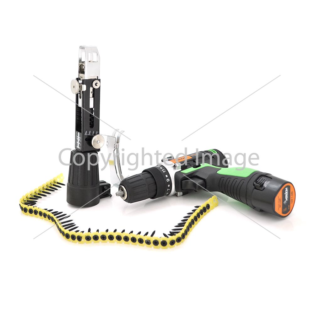 Шуруповерт, насадка для шурупів, стрічка з шурупами, зарядний пристрій, додаткова батарея, пластикова валізка для зберігання шуруповерта і комплектуючих.